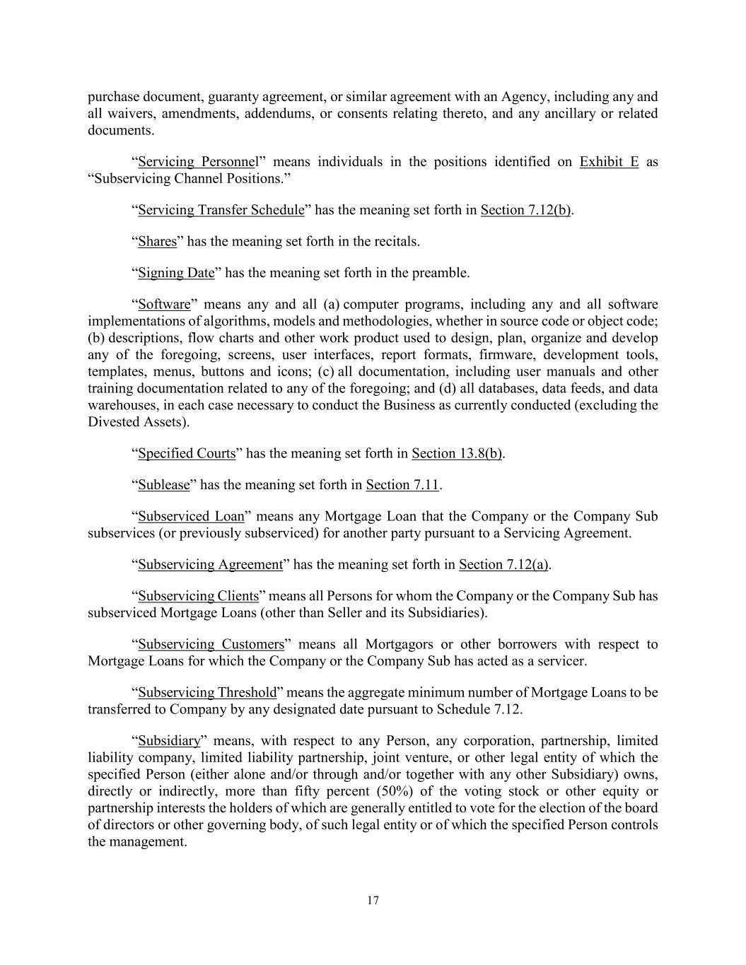 17 purchase document, guaranty agreement, or similar agreement with an Agency, including any and all waivers, amendments, addendums, or consents relating thereto, and any ancillary or related documents. “Servicing Personnel” means individuals in the positions identified on Exhibit E as “Subservicing Channel Positions.” “Servicing Transfer Schedule” has the meaning set forth in Section 7.12(b). “Shares” has the meaning set forth in the recitals. “Signing Date” has the meaning set forth in the preamble. “Software” means any and all (a) computer programs, including any and all software implementations of algorithms, models and methodologies, whether in source code or object code; (b) descriptions, flow charts and other work product used to design, plan, organize and develop any of the foregoing, screens, user interfaces, report formats, firmware, development tools, templates, menus, buttons and icons; (c) all documentation, including user manuals and other training documentation related to any of the foregoing; and (d) all databases, data feeds, and data warehouses, in each case necessary to conduct the Business as currently conducted (excluding the Divested Assets). “Specified Courts” has the meaning set forth in Section 13.8(b). “Sublease” has the meaning set forth in Section 7.11. “Subserviced Loan” means any Mortgage Loan that the Company or the Company Sub subservices (or previously subserviced) for another party pursuant to a Servicing Agreement. “Subservicing Agreement” has the meaning set forth in Section 7.12(a). “Subservicing Clients” means all Persons for whom the Company or the Company Sub has subserviced Mortgage Loans (other than Seller and its Subsidiaries). “Subservicing Customers” means all Mortgagors or other borrowers with respect to Mortgage Loans for which the Company or the Company Sub has acted as a servicer. “Subservicing Threshold” means the aggregate minimum number of Mortgage Loans to be transferred to Company by any designated date pursuant to Schedule 7.12. “Subsidiary” means, with respect to any Person, any corporation, partnership, limited liability company, limited liability partnership, joint venture, or other legal entity of which the specified Person (either alone and/or through and/or together with any other Subsidiary) owns, directly or indirectly, more than fifty percent (50%) of the voting stock or other equity or partnership interests the holders of which are generally entitled to vote for the election of the board of directors or other governing body, of such legal entity or of which the specified Person controls the management.