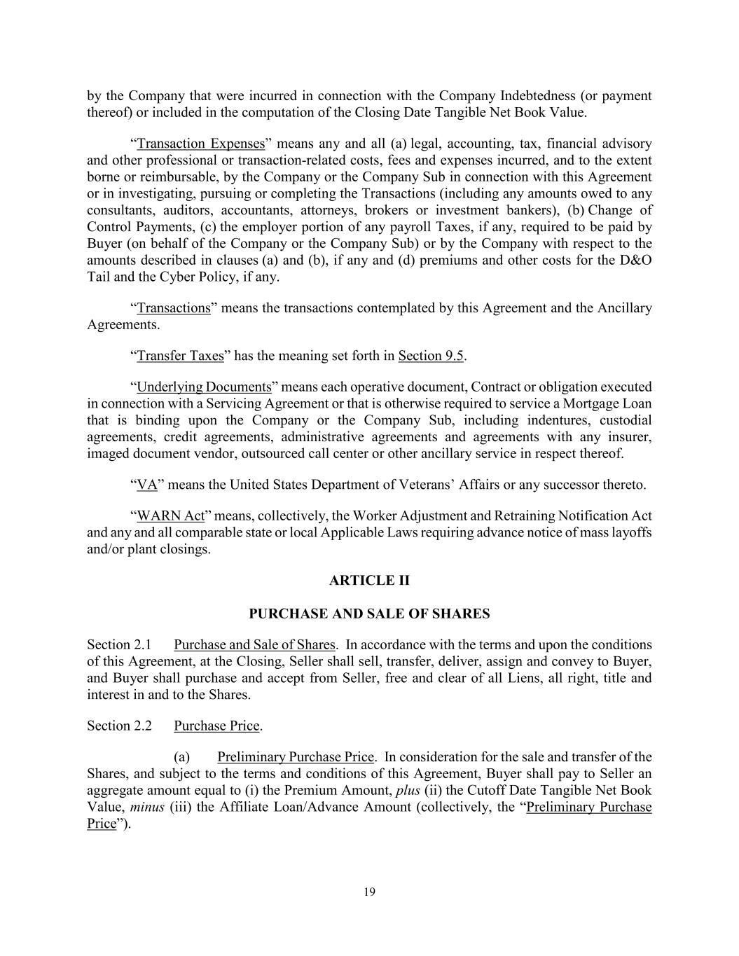 19 by the Company that were incurred in connection with the Company Indebtedness (or payment thereof) or included in the computation of the Closing Date Tangible Net Book Value. “Transaction Expenses” means any and all (a) legal, accounting, tax, financial advisory and other professional or transaction-related costs, fees and expenses incurred, and to the extent borne or reimbursable, by the Company or the Company Sub in connection with this Agreement or in investigating, pursuing or completing the Transactions (including any amounts owed to any consultants, auditors, accountants, attorneys, brokers or investment bankers), (b) Change of Control Payments, (c) the employer portion of any payroll Taxes, if any, required to be paid by Buyer (on behalf of the Company or the Company Sub) or by the Company with respect to the amounts described in clauses (a) and (b), if any and (d) premiums and other costs for the D&O Tail and the Cyber Policy, if any. “Transactions” means the transactions contemplated by this Agreement and the Ancillary Agreements. “Transfer Taxes” has the meaning set forth in Section 9.5. “Underlying Documents” means each operative document, Contract or obligation executed in connection with a Servicing Agreement or that is otherwise required to service a Mortgage Loan that is binding upon the Company or the Company Sub, including indentures, custodial agreements, credit agreements, administrative agreements and agreements with any insurer, imaged document vendor, outsourced call center or other ancillary service in respect thereof. “VA” means the United States Department of Veterans’ Affairs or any successor thereto. “WARN Act” means, collectively, the Worker Adjustment and Retraining Notification Act and any and all comparable state or local Applicable Laws requiring advance notice of mass layoffs and/or plant closings. ARTICLE II PURCHASE AND SALE OF SHARES Section 2.1 Purchase and Sale of Shares. In accordance with the terms and upon the conditions of this Agreement, at the Closing, Seller shall sell, transfer, deliver, assign and convey to Buyer, and Buyer shall purchase and accept from Seller, free and clear of all Liens, all right, title and interest in and to the Shares. Section 2.2 Purchase Price. (a) Preliminary Purchase Price. In consideration for the sale and transfer of the Shares, and subject to the terms and conditions of this Agreement, Buyer shall pay to Seller an aggregate amount equal to (i) the Premium Amount, plus (ii) the Cutoff Date Tangible Net Book Value, minus (iii) the Affiliate Loan/Advance Amount (collectively, the “Preliminary Purchase Price”).