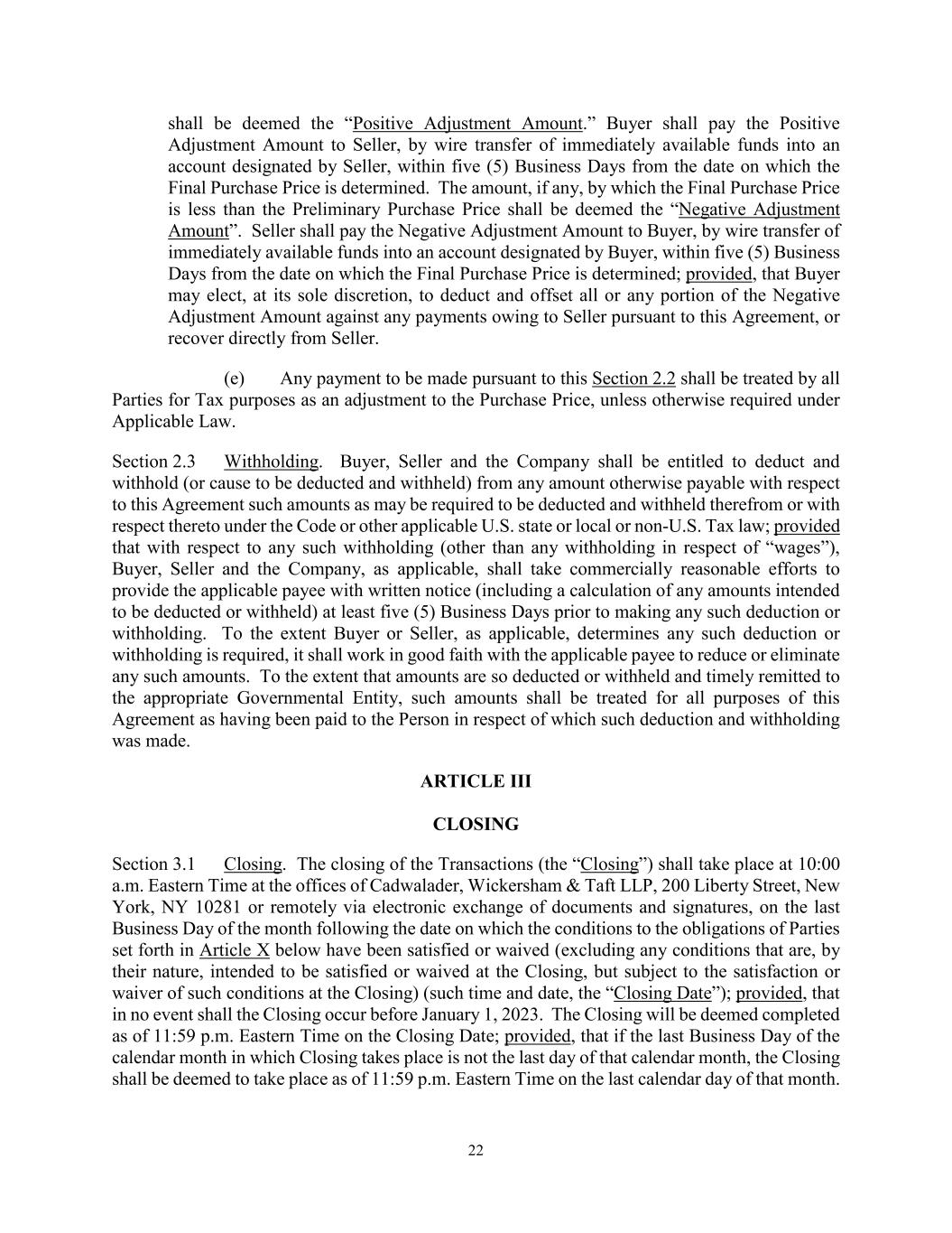 22 shall be deemed the “Positive Adjustment Amount.” Buyer shall pay the Positive Adjustment Amount to Seller, by wire transfer of immediately available funds into an account designated by Seller, within five (5) Business Days from the date on which the Final Purchase Price is determined. The amount, if any, by which the Final Purchase Price is less than the Preliminary Purchase Price shall be deemed the “Negative Adjustment Amount”. Seller shall pay the Negative Adjustment Amount to Buyer, by wire transfer of immediately available funds into an account designated by Buyer, within five (5) Business Days from the date on which the Final Purchase Price is determined; provided, that Buyer may elect, at its sole discretion, to deduct and offset all or any portion of the Negative Adjustment Amount against any payments owing to Seller pursuant to this Agreement, or recover directly from Seller. (e) Any payment to be made pursuant to this Section 2.2 shall be treated by all Parties for Tax purposes as an adjustment to the Purchase Price, unless otherwise required under Applicable Law. Section 2.3 Withholding. Buyer, Seller and the Company shall be entitled to deduct and withhold (or cause to be deducted and withheld) from any amount otherwise payable with respect to this Agreement such amounts as may be required to be deducted and withheld therefrom or with respect thereto under the Code or other applicable U.S. state or local or non-U.S. Tax law; provided that with respect to any such withholding (other than any withholding in respect of “wages”), Buyer, Seller and the Company, as applicable, shall take commercially reasonable efforts to provide the applicable payee with written notice (including a calculation of any amounts intended to be deducted or withheld) at least five (5) Business Days prior to making any such deduction or withholding. To the extent Buyer or Seller, as applicable, determines any such deduction or withholding is required, it shall work in good faith with the applicable payee to reduce or eliminate any such amounts. To the extent that amounts are so deducted or withheld and timely remitted to the appropriate Governmental Entity, such amounts shall be treated for all purposes of this Agreement as having been paid to the Person in respect of which such deduction and withholding was made. ARTICLE III CLOSING Section 3.1 Closing. The closing of the Transactions (the “Closing”) shall take place at 10:00 a.m. Eastern Time at the offices of Cadwalader, Wickersham & Taft LLP, 200 Liberty Street, New York, NY 10281 or remotely via electronic exchange of documents and signatures, on the last Business Day of the month following the date on which the conditions to the obligations of Parties set forth in Article X below have been satisfied or waived (excluding any conditions that are, by their nature, intended to be satisfied or waived at the Closing, but subject to the satisfaction or waiver of such conditions at the Closing) (such time and date, the “Closing Date”); provided, that in no event shall the Closing occur before January 1, 2023. The Closing will be deemed completed as of 11:59 p.m. Eastern Time on the Closing Date; provided, that if the last Business Day of the calendar month in which Closing takes place is not the last day of that calendar month, the Closing shall be deemed to take place as of 11:59 p.m. Eastern Time on the last calendar day of that month.