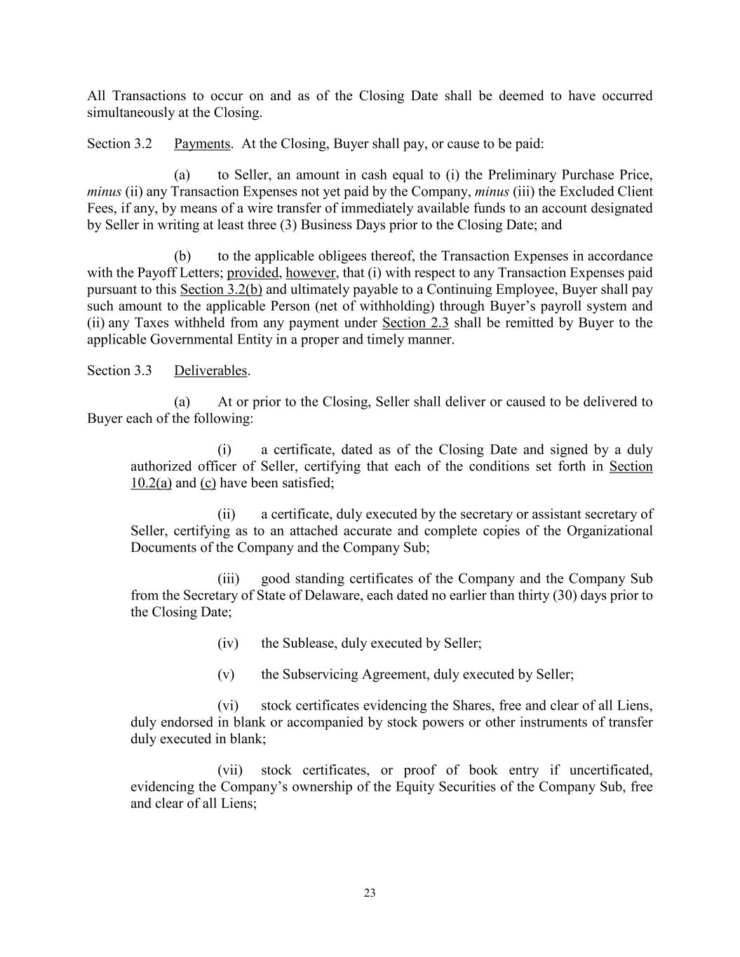 23 All Transactions to occur on and as of the Closing Date shall be deemed to have occurred simultaneously at the Closing. Section 3.2 Payments. At the Closing, Buyer shall pay, or cause to be paid: (a) to Seller, an amount in cash equal to (i) the Preliminary Purchase Price, minus (ii) any Transaction Expenses not yet paid by the Company, minus (iii) the Excluded Client Fees, if any, by means of a wire transfer of immediately available funds to an account designated by Seller in writing at least three (3) Business Days prior to the Closing Date; and (b) to the applicable obligees thereof, the Transaction Expenses in accordance with the Payoff Letters; provided, however, that (i) with respect to any Transaction Expenses paid pursuant to this Section 3.2(b) and ultimately payable to a Continuing Employee, Buyer shall pay such amount to the applicable Person (net of withholding) through Buyer’s payroll system and (ii) any Taxes withheld from any payment under Section 2.3 shall be remitted by Buyer to the applicable Governmental Entity in a proper and timely manner. Section 3.3 Deliverables. (a) At or prior to the Closing, Seller shall deliver or caused to be delivered to Buyer each of the following: (i) a certificate, dated as of the Closing Date and signed by a duly authorized officer of Seller, certifying that each of the conditions set forth in Section 10.2(a) and (c) have been satisfied; (ii) a certificate, duly executed by the secretary or assistant secretary of Seller, certifying as to an attached accurate and complete copies of the Organizational Documents of the Company and the Company Sub; (iii) good standing certificates of the Company and the Company Sub from the Secretary of State of Delaware, each dated no earlier than thirty (30) days prior to the Closing Date; (iv) the Sublease, duly executed by Seller; (v) the Subservicing Agreement, duly executed by Seller; (vi) stock certificates evidencing the Shares, free and clear of all Liens, duly endorsed in blank or accompanied by stock powers or other instruments of transfer duly executed in blank; (vii) stock certificates, or proof of book entry if uncertificated, evidencing the Company’s ownership of the Equity Securities of the Company Sub, free and clear of all Liens;