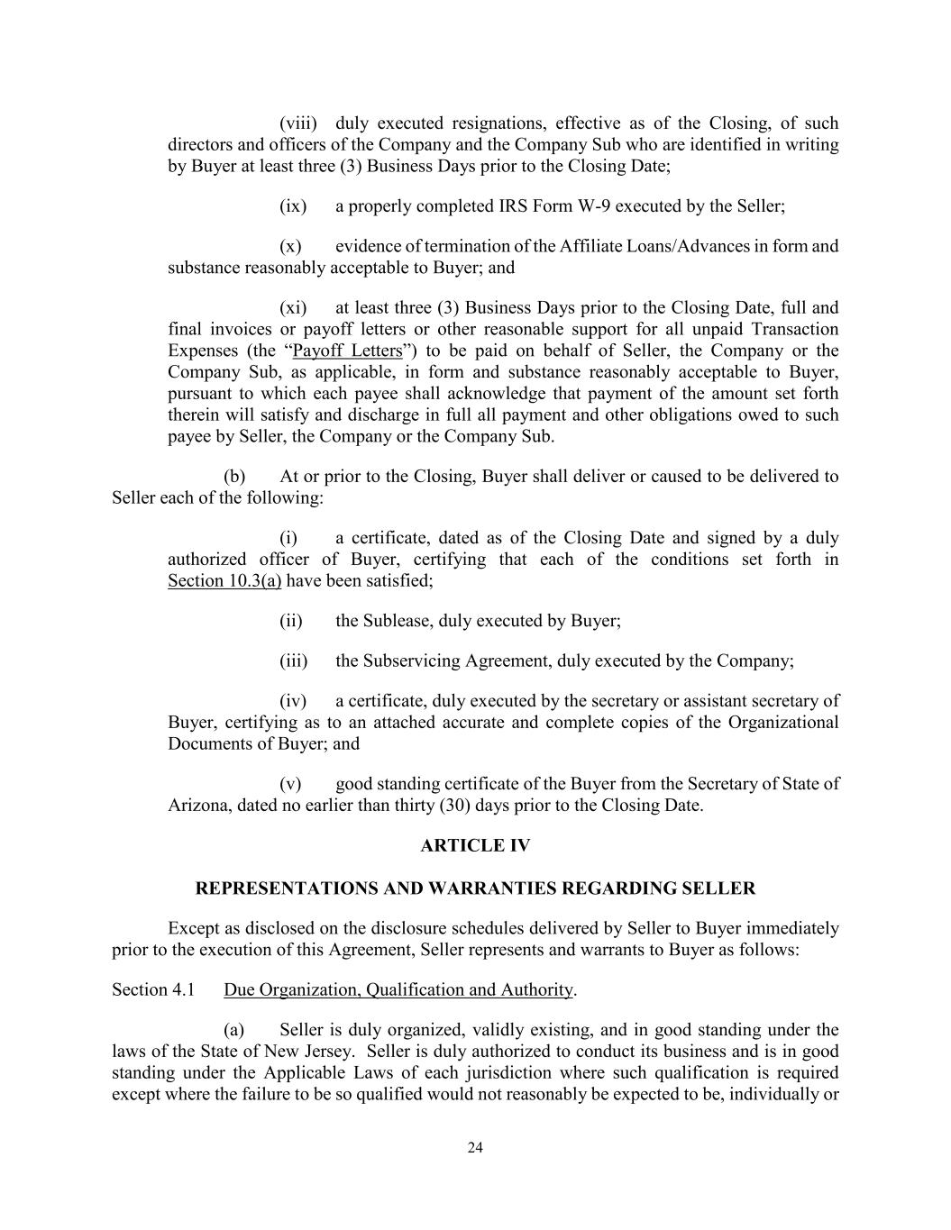 24 (viii) duly executed resignations, effective as of the Closing, of such directors and officers of the Company and the Company Sub who are identified in writing by Buyer at least three (3) Business Days prior to the Closing Date; (ix) a properly completed IRS Form W-9 executed by the Seller; (x) evidence of termination of the Affiliate Loans/Advances in form and substance reasonably acceptable to Buyer; and (xi) at least three (3) Business Days prior to the Closing Date, full and final invoices or payoff letters or other reasonable support for all unpaid Transaction Expenses (the “Payoff Letters”) to be paid on behalf of Seller, the Company or the Company Sub, as applicable, in form and substance reasonably acceptable to Buyer, pursuant to which each payee shall acknowledge that payment of the amount set forth therein will satisfy and discharge in full all payment and other obligations owed to such payee by Seller, the Company or the Company Sub. (b) At or prior to the Closing, Buyer shall deliver or caused to be delivered to Seller each of the following: (i) a certificate, dated as of the Closing Date and signed by a duly authorized officer of Buyer, certifying that each of the conditions set forth in Section 10.3(a) have been satisfied; (ii) the Sublease, duly executed by Buyer; (iii) the Subservicing Agreement, duly executed by the Company; (iv) a certificate, duly executed by the secretary or assistant secretary of Buyer, certifying as to an attached accurate and complete copies of the Organizational Documents of Buyer; and (v) good standing certificate of the Buyer from the Secretary of State of Arizona, dated no earlier than thirty (30) days prior to the Closing Date. ARTICLE IV REPRESENTATIONS AND WARRANTIES REGARDING SELLER Except as disclosed on the disclosure schedules delivered by Seller to Buyer immediately prior to the execution of this Agreement, Seller represents and warrants to Buyer as follows: Section 4.1 Due Organization, Qualification and Authority. (a) Seller is duly organized, validly existing, and in good standing under the laws of the State of New Jersey. Seller is duly authorized to conduct its business and is in good standing under the Applicable Laws of each jurisdiction where such qualification is required except where the failure to be so qualified would not reasonably be expected to be, individually or