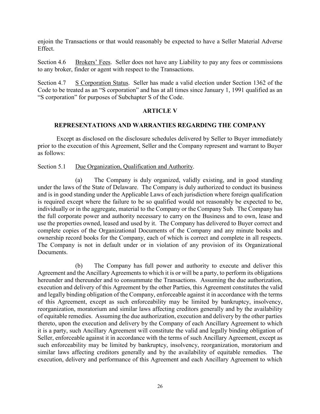 26 enjoin the Transactions or that would reasonably be expected to have a Seller Material Adverse Effect. Section 4.6 Brokers’ Fees. Seller does not have any Liability to pay any fees or commissions to any broker, finder or agent with respect to the Transactions. Section 4.7 S Corporation Status. Seller has made a valid election under Section 1362 of the Code to be treated as an “S corporation” and has at all times since January 1, 1991 qualified as an “S corporation” for purposes of Subchapter S of the Code. ARTICLE V REPRESENTATIONS AND WARRANTIES REGARDING THE COMPANY Except as disclosed on the disclosure schedules delivered by Seller to Buyer immediately prior to the execution of this Agreement, Seller and the Company represent and warrant to Buyer as follows: Section 5.1 Due Organization, Qualification and Authority. (a) The Company is duly organized, validly existing, and in good standing under the laws of the State of Delaware. The Company is duly authorized to conduct its business and is in good standing under the Applicable Laws of each jurisdiction where foreign qualification is required except where the failure to be so qualified would not reasonably be expected to be, individually or in the aggregate, material to the Company or the Company Sub. The Company has the full corporate power and authority necessary to carry on the Business and to own, lease and use the properties owned, leased and used by it. The Company has delivered to Buyer correct and complete copies of the Organizational Documents of the Company and any minute books and ownership record books for the Company, each of which is correct and complete in all respects. The Company is not in default under or in violation of any provision of its Organizational Documents. (b) The Company has full power and authority to execute and deliver this Agreement and the Ancillary Agreements to which it is or will be a party, to perform its obligations hereunder and thereunder and to consummate the Transactions. Assuming the due authorization, execution and delivery of this Agreement by the other Parties, this Agreement constitutes the valid and legally binding obligation of the Company, enforceable against it in accordance with the terms of this Agreement, except as such enforceability may be limited by bankruptcy, insolvency, reorganization, moratorium and similar laws affecting creditors generally and by the availability of equitable remedies. Assuming the due authorization, execution and delivery by the other parties thereto, upon the execution and delivery by the Company of each Ancillary Agreement to which it is a party, such Ancillary Agreement will constitute the valid and legally binding obligation of Seller, enforceable against it in accordance with the terms of such Ancillary Agreement, except as such enforceability may be limited by bankruptcy, insolvency, reorganization, moratorium and similar laws affecting creditors generally and by the availability of equitable remedies. The execution, delivery and performance of this Agreement and each Ancillary Agreement to which