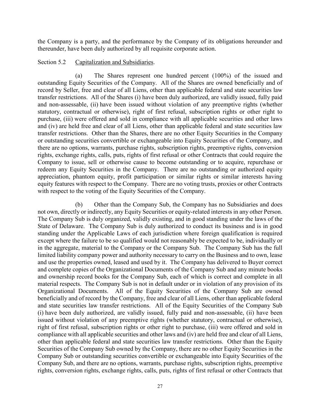 27 the Company is a party, and the performance by the Company of its obligations hereunder and thereunder, have been duly authorized by all requisite corporate action. Section 5.2 Capitalization and Subsidiaries. (a) The Shares represent one hundred percent (100%) of the issued and outstanding Equity Securities of the Company. All of the Shares are owned beneficially and of record by Seller, free and clear of all Liens, other than applicable federal and state securities law transfer restrictions. All of the Shares (i) have been duly authorized, are validly issued, fully paid and non-assessable, (ii) have been issued without violation of any preemptive rights (whether statutory, contractual or otherwise), right of first refusal, subscription rights or other right to purchase, (iii) were offered and sold in compliance with all applicable securities and other laws and (iv) are held free and clear of all Liens, other than applicable federal and state securities law transfer restrictions. Other than the Shares, there are no other Equity Securities in the Company or outstanding securities convertible or exchangeable into Equity Securities of the Company, and there are no options, warrants, purchase rights, subscription rights, preemptive rights, conversion rights, exchange rights, calls, puts, rights of first refusal or other Contracts that could require the Company to issue, sell or otherwise cause to become outstanding or to acquire, repurchase or redeem any Equity Securities in the Company. There are no outstanding or authorized equity appreciation, phantom equity, profit participation or similar rights or similar interests having equity features with respect to the Company. There are no voting trusts, proxies or other Contracts with respect to the voting of the Equity Securities of the Company. (b) Other than the Company Sub, the Company has no Subsidiaries and does not own, directly or indirectly, any Equity Securities or equity-related interests in any other Person. The Company Sub is duly organized, validly existing, and in good standing under the laws of the State of Delaware. The Company Sub is duly authorized to conduct its business and is in good standing under the Applicable Laws of each jurisdiction where foreign qualification is required except where the failure to be so qualified would not reasonably be expected to be, individually or in the aggregate, material to the Company or the Company Sub. The Company Sub has the full limited liability company power and authority necessary to carry on the Business and to own, lease and use the properties owned, leased and used by it. The Company has delivered to Buyer correct and complete copies of the Organizational Documents of the Company Sub and any minute books and ownership record books for the Company Sub, each of which is correct and complete in all material respects. The Company Sub is not in default under or in violation of any provision of its Organizational Documents. All of the Equity Securities of the Company Sub are owned beneficially and of record by the Company, free and clear of all Liens, other than applicable federal and state securities law transfer restrictions. All of the Equity Securities of the Company Sub (i) have been duly authorized, are validly issued, fully paid and non-assessable, (ii) have been issued without violation of any preemptive rights (whether statutory, contractual or otherwise), right of first refusal, subscription rights or other right to purchase, (iii) were offered and sold in compliance with all applicable securities and other laws and (iv) are held free and clear of all Liens, other than applicable federal and state securities law transfer restrictions. Other than the Equity Securities of the Company Sub owned by the Company, there are no other Equity Securities in the Company Sub or outstanding securities convertible or exchangeable into Equity Securities of the Company Sub, and there are no options, warrants, purchase rights, subscription rights, preemptive rights, conversion rights, exchange rights, calls, puts, rights of first refusal or other Contracts that