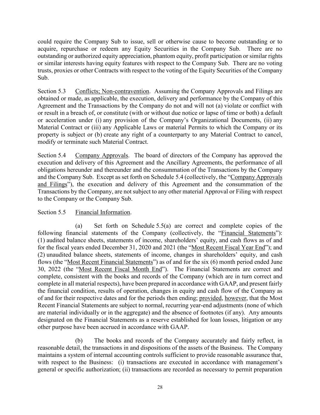 28 could require the Company Sub to issue, sell or otherwise cause to become outstanding or to acquire, repurchase or redeem any Equity Securities in the Company Sub. There are no outstanding or authorized equity appreciation, phantom equity, profit participation or similar rights or similar interests having equity features with respect to the Company Sub. There are no voting trusts, proxies or other Contracts with respect to the voting of the Equity Securities of the Company Sub. Section 5.3 Conflicts; Non-contravention. Assuming the Company Approvals and Filings are obtained or made, as applicable, the execution, delivery and performance by the Company of this Agreement and the Transactions by the Company do not and will not (a) violate or conflict with or result in a breach of, or constitute (with or without due notice or lapse of time or both) a default or acceleration under (i) any provision of the Company’s Organizational Documents, (ii) any Material Contract or (iii) any Applicable Laws or material Permits to which the Company or its property is subject or (b) create any right of a counterparty to any Material Contract to cancel, modify or terminate such Material Contract. Section 5.4 Company Approvals. The board of directors of the Company has approved the execution and delivery of this Agreement and the Ancillary Agreements, the performance of all obligations hereunder and thereunder and the consummation of the Transactions by the Company and the Company Sub. Except as set forth on Schedule 5.4 (collectively, the “Company Approvals and Filings”), the execution and delivery of this Agreement and the consummation of the Transactions by the Company, are not subject to any other material Approval or Filing with respect to the Company or the Company Sub. Section 5.5 Financial Information. (a) Set forth on Schedule 5.5(a) are correct and complete copies of the following financial statements of the Company (collectively, the “Financial Statements”): (1) audited balance sheets, statements of income, shareholders’ equity, and cash flows as of and for the fiscal years ended December 31, 2020 and 2021 (the “Most Recent Fiscal Year End”); and (2) unaudited balance sheets, statements of income, changes in shareholders’ equity, and cash flows (the “Most Recent Financial Statements”) as of and for the six (6) month period ended June 30, 2022 (the “Most Recent Fiscal Month End”). The Financial Statements are correct and complete, consistent with the books and records of the Company (which are in turn correct and complete in all material respects), have been prepared in accordance with GAAP, and present fairly the financial condition, results of operation, changes in equity and cash flow of the Company as of and for their respective dates and for the periods then ending; provided, however, that the Most Recent Financial Statements are subject to normal, recurring year-end adjustments (none of which are material individually or in the aggregate) and the absence of footnotes (if any). Any amounts designated on the Financial Statements as a reserve established for loan losses, litigation or any other purpose have been accrued in accordance with GAAP. (b) The books and records of the Company accurately and fairly reflect, in reasonable detail, the transactions in and dispositions of the assets of the Business. The Company maintains a system of internal accounting controls sufficient to provide reasonable assurance that, with respect to the Business: (i) transactions are executed in accordance with management’s general or specific authorization; (ii) transactions are recorded as necessary to permit preparation