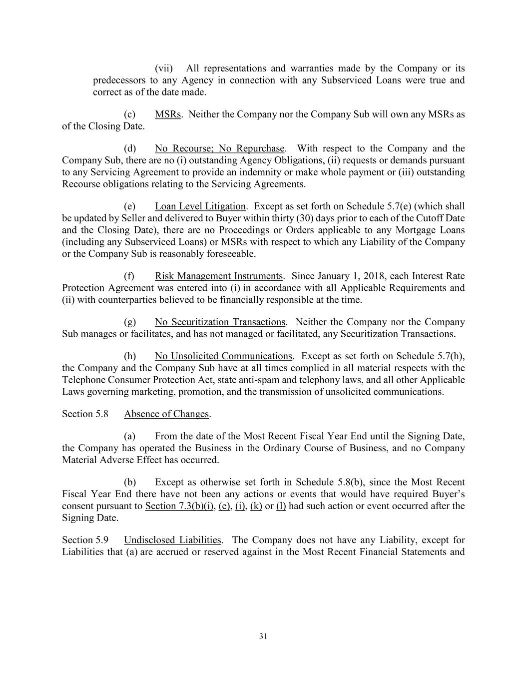 31 (vii) All representations and warranties made by the Company or its predecessors to any Agency in connection with any Subserviced Loans were true and correct as of the date made. (c) MSRs. Neither the Company nor the Company Sub will own any MSRs as of the Closing Date. (d) No Recourse; No Repurchase. With respect to the Company and the Company Sub, there are no (i) outstanding Agency Obligations, (ii) requests or demands pursuant to any Servicing Agreement to provide an indemnity or make whole payment or (iii) outstanding Recourse obligations relating to the Servicing Agreements. (e) Loan Level Litigation. Except as set forth on Schedule 5.7(e) (which shall be updated by Seller and delivered to Buyer within thirty (30) days prior to each of the Cutoff Date and the Closing Date), there are no Proceedings or Orders applicable to any Mortgage Loans (including any Subserviced Loans) or MSRs with respect to which any Liability of the Company or the Company Sub is reasonably foreseeable. (f) Risk Management Instruments. Since January 1, 2018, each Interest Rate Protection Agreement was entered into (i) in accordance with all Applicable Requirements and (ii) with counterparties believed to be financially responsible at the time. (g) No Securitization Transactions. Neither the Company nor the Company Sub manages or facilitates, and has not managed or facilitated, any Securitization Transactions. (h) No Unsolicited Communications. Except as set forth on Schedule 5.7(h), the Company and the Company Sub have at all times complied in all material respects with the Telephone Consumer Protection Act, state anti-spam and telephony laws, and all other Applicable Laws governing marketing, promotion, and the transmission of unsolicited communications. Section 5.8 Absence of Changes. (a) From the date of the Most Recent Fiscal Year End until the Signing Date, the Company has operated the Business in the Ordinary Course of Business, and no Company Material Adverse Effect has occurred. (b) Except as otherwise set forth in Schedule 5.8(b), since the Most Recent Fiscal Year End there have not been any actions or events that would have required Buyer’s consent pursuant to Section 7.3(b)(i), (e), (i), (k) or (l) had such action or event occurred after the Signing Date. Section 5.9 Undisclosed Liabilities. The Company does not have any Liability, except for Liabilities that (a) are accrued or reserved against in the Most Recent Financial Statements and