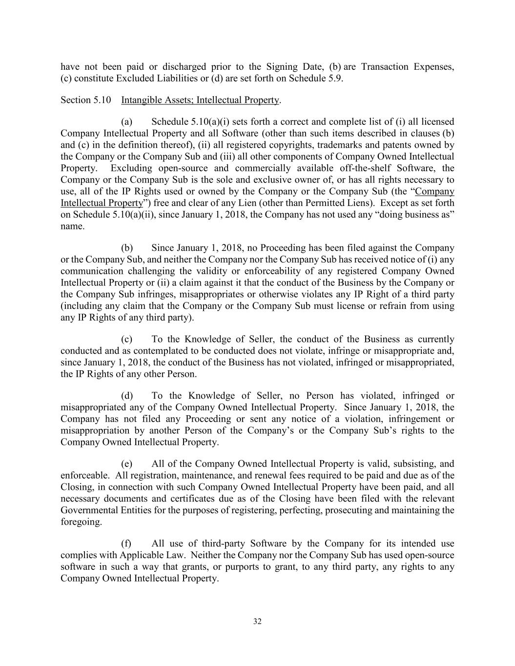 32 have not been paid or discharged prior to the Signing Date, (b) are Transaction Expenses, (c) constitute Excluded Liabilities or (d) are set forth on Schedule 5.9. Section 5.10 Intangible Assets; Intellectual Property. (a) Schedule 5.10(a)(i) sets forth a correct and complete list of (i) all licensed Company Intellectual Property and all Software (other than such items described in clauses (b) and (c) in the definition thereof), (ii) all registered copyrights, trademarks and patents owned by the Company or the Company Sub and (iii) all other components of Company Owned Intellectual Property. Excluding open-source and commercially available off-the-shelf Software, the Company or the Company Sub is the sole and exclusive owner of, or has all rights necessary to use, all of the IP Rights used or owned by the Company or the Company Sub (the “Company Intellectual Property”) free and clear of any Lien (other than Permitted Liens). Except as set forth on Schedule 5.10(a)(ii), since January 1, 2018, the Company has not used any “doing business as” name. (b) Since January 1, 2018, no Proceeding has been filed against the Company or the Company Sub, and neither the Company nor the Company Sub has received notice of (i) any communication challenging the validity or enforceability of any registered Company Owned Intellectual Property or (ii) a claim against it that the conduct of the Business by the Company or the Company Sub infringes, misappropriates or otherwise violates any IP Right of a third party (including any claim that the Company or the Company Sub must license or refrain from using any IP Rights of any third party). (c) To the Knowledge of Seller, the conduct of the Business as currently conducted and as contemplated to be conducted does not violate, infringe or misappropriate and, since January 1, 2018, the conduct of the Business has not violated, infringed or misappropriated, the IP Rights of any other Person. (d) To the Knowledge of Seller, no Person has violated, infringed or misappropriated any of the Company Owned Intellectual Property. Since January 1, 2018, the Company has not filed any Proceeding or sent any notice of a violation, infringement or misappropriation by another Person of the Company’s or the Company Sub’s rights to the Company Owned Intellectual Property. (e) All of the Company Owned Intellectual Property is valid, subsisting, and enforceable. All registration, maintenance, and renewal fees required to be paid and due as of the Closing, in connection with such Company Owned Intellectual Property have been paid, and all necessary documents and certificates due as of the Closing have been filed with the relevant Governmental Entities for the purposes of registering, perfecting, prosecuting and maintaining the foregoing. (f) All use of third-party Software by the Company for its intended use complies with Applicable Law. Neither the Company nor the Company Sub has used open-source software in such a way that grants, or purports to grant, to any third party, any rights to any Company Owned Intellectual Property.