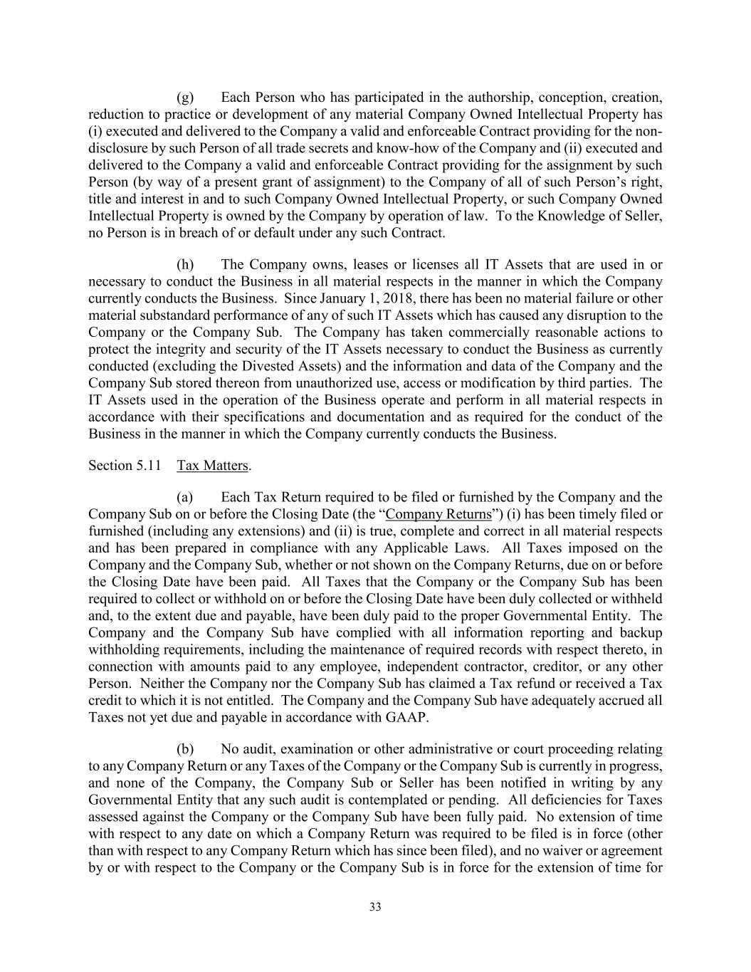 33 (g) Each Person who has participated in the authorship, conception, creation, reduction to practice or development of any material Company Owned Intellectual Property has (i) executed and delivered to the Company a valid and enforceable Contract providing for the non- disclosure by such Person of all trade secrets and know-how of the Company and (ii) executed and delivered to the Company a valid and enforceable Contract providing for the assignment by such Person (by way of a present grant of assignment) to the Company of all of such Person’s right, title and interest in and to such Company Owned Intellectual Property, or such Company Owned Intellectual Property is owned by the Company by operation of law. To the Knowledge of Seller, no Person is in breach of or default under any such Contract. (h) The Company owns, leases or licenses all IT Assets that are used in or necessary to conduct the Business in all material respects in the manner in which the Company currently conducts the Business. Since January 1, 2018, there has been no material failure or other material substandard performance of any of such IT Assets which has caused any disruption to the Company or the Company Sub. The Company has taken commercially reasonable actions to protect the integrity and security of the IT Assets necessary to conduct the Business as currently conducted (excluding the Divested Assets) and the information and data of the Company and the Company Sub stored thereon from unauthorized use, access or modification by third parties. The IT Assets used in the operation of the Business operate and perform in all material respects in accordance with their specifications and documentation and as required for the conduct of the Business in the manner in which the Company currently conducts the Business. Section 5.11 Tax Matters. (a) Each Tax Return required to be filed or furnished by the Company and the Company Sub on or before the Closing Date (the “Company Returns”) (i) has been timely filed or furnished (including any extensions) and (ii) is true, complete and correct in all material respects and has been prepared in compliance with any Applicable Laws. All Taxes imposed on the Company and the Company Sub, whether or not shown on the Company Returns, due on or before the Closing Date have been paid. All Taxes that the Company or the Company Sub has been required to collect or withhold on or before the Closing Date have been duly collected or withheld and, to the extent due and payable, have been duly paid to the proper Governmental Entity. The Company and the Company Sub have complied with all information reporting and backup withholding requirements, including the maintenance of required records with respect thereto, in connection with amounts paid to any employee, independent contractor, creditor, or any other Person. Neither the Company nor the Company Sub has claimed a Tax refund or received a Tax credit to which it is not entitled. The Company and the Company Sub have adequately accrued all Taxes not yet due and payable in accordance with GAAP. (b) No audit, examination or other administrative or court proceeding relating to any Company Return or any Taxes of the Company or the Company Sub is currently in progress, and none of the Company, the Company Sub or Seller has been notified in writing by any Governmental Entity that any such audit is contemplated or pending. All deficiencies for Taxes assessed against the Company or the Company Sub have been fully paid. No extension of time with respect to any date on which a Company Return was required to be filed is in force (other than with respect to any Company Return which has since been filed), and no waiver or agreement by or with respect to the Company or the Company Sub is in force for the extension of time for