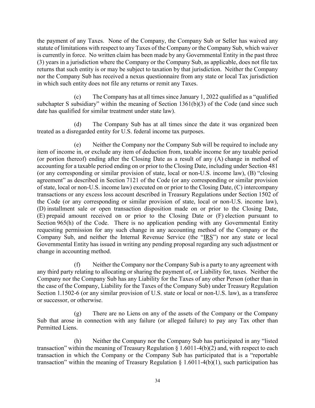 34 the payment of any Taxes. None of the Company, the Company Sub or Seller has waived any statute of limitations with respect to any Taxes of the Company or the Company Sub, which waiver is currently in force. No written claim has been made by any Governmental Entity in the past three (3) years in a jurisdiction where the Company or the Company Sub, as applicable, does not file tax returns that such entity is or may be subject to taxation by that jurisdiction. Neither the Company nor the Company Sub has received a nexus questionnaire from any state or local Tax jurisdiction in which such entity does not file any returns or remit any Taxes. (c) The Company has at all times since January 1, 2022 qualified as a “qualified subchapter S subsidiary” within the meaning of Section 1361(b)(3) of the Code (and since such date has qualified for similar treatment under state law). (d) The Company Sub has at all times since the date it was organized been treated as a disregarded entity for U.S. federal income tax purposes. (e) Neither the Company nor the Company Sub will be required to include any item of income in, or exclude any item of deduction from, taxable income for any taxable period (or portion thereof) ending after the Closing Date as a result of any (A) change in method of accounting for a taxable period ending on or prior to the Closing Date, including under Section 481 (or any corresponding or similar provision of state, local or non-U.S. income law), (B) “closing agreement” as described in Section 7121 of the Code (or any corresponding or similar provision of state, local or non-U.S. income law) executed on or prior to the Closing Date, (C) intercompany transactions or any excess loss account described in Treasury Regulations under Section 1502 of the Code (or any corresponding or similar provision of state, local or non-U.S. income law), (D) installment sale or open transaction disposition made on or prior to the Closing Date, (E) prepaid amount received on or prior to the Closing Date or (F) election pursuant to Section 965(h) of the Code. There is no application pending with any Governmental Entity requesting permission for any such change in any accounting method of the Company or the Company Sub, and neither the Internal Revenue Service (the “IRS”) nor any state or local Governmental Entity has issued in writing any pending proposal regarding any such adjustment or change in accounting method. (f) Neither the Company nor the Company Sub is a party to any agreement with any third party relating to allocating or sharing the payment of, or Liability for, taxes. Neither the Company nor the Company Sub has any Liability for the Taxes of any other Person (other than in the case of the Company, Liability for the Taxes of the Company Sub) under Treasury Regulation Section 1.1502-6 (or any similar provision of U.S. state or local or non-U.S. law), as a transferee or successor, or otherwise. (g) There are no Liens on any of the assets of the Company or the Company Sub that arose in connection with any failure (or alleged failure) to pay any Tax other than Permitted Liens. (h) Neither the Company nor the Company Sub has participated in any “listed transaction” within the meaning of Treasury Regulation § 1.6011-4(b)(2) and, with respect to each transaction in which the Company or the Company Sub has participated that is a “reportable transaction” within the meaning of Treasury Regulation § 1.6011-4(b)(1), such participation has