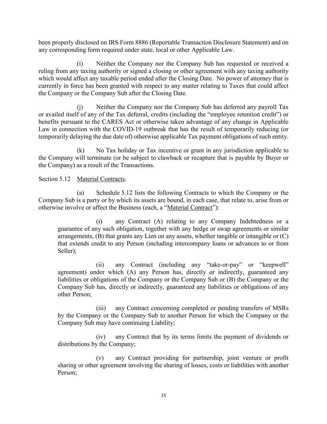 35 been properly disclosed on IRS Form 8886 (Reportable Transaction Disclosure Statement) and on any corresponding form required under state, local or other Applicable Law. (i) Neither the Company nor the Company Sub has requested or received a ruling from any taxing authority or signed a closing or other agreement with any taxing authority which would affect any taxable period ended after the Closing Date. No power of attorney that is currently in force has been granted with respect to any matter relating to Taxes that could affect the Company or the Company Sub after the Closing Date. (j) Neither the Company nor the Company Sub has deferred any payroll Tax or availed itself of any of the Tax deferral, credits (including the “employee retention credit”) or benefits pursuant to the CARES Act or otherwise taken advantage of any change in Applicable Law in connection with the COVID-19 outbreak that has the result of temporarily reducing (or temporarily delaying the due date of) otherwise applicable Tax payment obligations of such entity. (k) No Tax holiday or Tax incentive or grant in any jurisdiction applicable to the Company will terminate (or be subject to clawback or recapture that is payable by Buyer or the Company) as a result of the Transactions. Section 5.12 Material Contracts. (a) Schedule 5.12 lists the following Contracts to which the Company or the Company Sub is a party or by which its assets are bound, in each case, that relate to, arise from or otherwise involve or affect the Business (each, a “Material Contract”): (i) any Contract (A) relating to any Company Indebtedness or a guarantee of any such obligation, together with any hedge or swap agreements or similar arrangements, (B) that grants any Lien on any assets, whether tangible or intangible or (C) that extends credit to any Person (including intercompany loans or advances to or from Seller); (ii) any Contract (including any “take-or-pay” or “keepwell” agreement) under which (A) any Person has, directly or indirectly, guaranteed any liabilities or obligations of the Company or the Company Sub or (B) the Company or the Company Sub has, directly or indirectly, guaranteed any liabilities or obligations of any other Person; (iii) any Contract concerning completed or pending transfers of MSRs by the Company or the Company Sub to another Person for which the Company or the Company Sub may have continuing Liability; (iv) any Contract that by its terms limits the payment of dividends or distributions by the Company; (v) any Contract providing for partnership, joint venture or profit sharing or other agreement involving the sharing of losses, costs or liabilities with another Person;