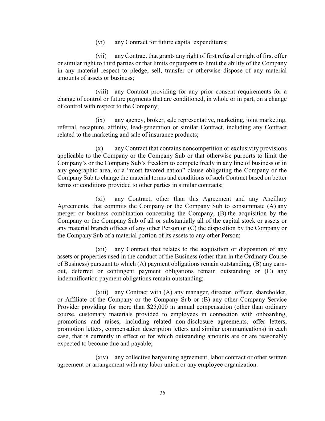 36 (vi) any Contract for future capital expenditures; (vii) any Contract that grants any right of first refusal or right of first offer or similar right to third parties or that limits or purports to limit the ability of the Company in any material respect to pledge, sell, transfer or otherwise dispose of any material amounts of assets or business; (viii) any Contract providing for any prior consent requirements for a change of control or future payments that are conditioned, in whole or in part, on a change of control with respect to the Company; (ix) any agency, broker, sale representative, marketing, joint marketing, referral, recapture, affinity, lead-generation or similar Contract, including any Contract related to the marketing and sale of insurance products; (x) any Contract that contains noncompetition or exclusivity provisions applicable to the Company or the Company Sub or that otherwise purports to limit the Company’s or the Company Sub’s freedom to compete freely in any line of business or in any geographic area, or a “most favored nation” clause obligating the Company or the Company Sub to change the material terms and conditions of such Contract based on better terms or conditions provided to other parties in similar contracts; (xi) any Contract, other than this Agreement and any Ancillary Agreements, that commits the Company or the Company Sub to consummate (A) any merger or business combination concerning the Company, (B) the acquisition by the Company or the Company Sub of all or substantially all of the capital stock or assets or any material branch offices of any other Person or (C) the disposition by the Company or the Company Sub of a material portion of its assets to any other Person; (xii) any Contract that relates to the acquisition or disposition of any assets or properties used in the conduct of the Business (other than in the Ordinary Course of Business) pursuant to which (A) payment obligations remain outstanding, (B) any earn- out, deferred or contingent payment obligations remain outstanding or (C) any indemnification payment obligations remain outstanding; (xiii) any Contract with (A) any manager, director, officer, shareholder, or Affiliate of the Company or the Company Sub or (B) any other Company Service Provider providing for more than $25,000 in annual compensation (other than ordinary course, customary materials provided to employees in connection with onboarding, promotions and raises, including related non-disclosure agreements, offer letters, promotion letters, compensation description letters and similar communications) in each case, that is currently in effect or for which outstanding amounts are or are reasonably expected to become due and payable; (xiv) any collective bargaining agreement, labor contract or other written agreement or arrangement with any labor union or any employee organization.