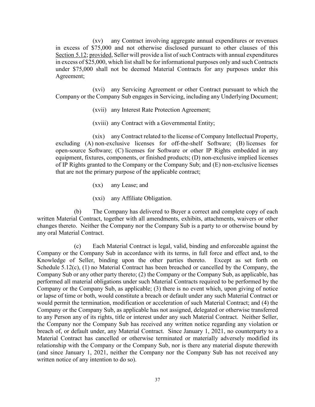 37 (xv) any Contract involving aggregate annual expenditures or revenues in excess of $75,000 and not otherwise disclosed pursuant to other clauses of this Section 5.12; provided, Seller will provide a list of such Contracts with annual expenditures in excess of $25,000, which list shall be for informational purposes only and such Contracts under $75,000 shall not be deemed Material Contracts for any purposes under this Agreement; (xvi) any Servicing Agreement or other Contract pursuant to which the Company or the Company Sub engages in Servicing, including any Underlying Document; (xvii) any Interest Rate Protection Agreement; (xviii) any Contract with a Governmental Entity; (xix) any Contract related to the license of Company Intellectual Property, excluding (A) non-exclusive licenses for off-the-shelf Software; (B) licenses for open-source Software; (C) licenses for Software or other IP Rights embedded in any equipment, fixtures, components, or finished products; (D) non-exclusive implied licenses of IP Rights granted to the Company or the Company Sub; and (E) non-exclusive licenses that are not the primary purpose of the applicable contract; (xx) any Lease; and (xxi) any Affiliate Obligation. (b) The Company has delivered to Buyer a correct and complete copy of each written Material Contract, together with all amendments, exhibits, attachments, waivers or other changes thereto. Neither the Company nor the Company Sub is a party to or otherwise bound by any oral Material Contract. (c) Each Material Contract is legal, valid, binding and enforceable against the Company or the Company Sub in accordance with its terms, in full force and effect and, to the Knowledge of Seller, binding upon the other parties thereto. Except as set forth on Schedule 5.12(c), (1) no Material Contract has been breached or cancelled by the Company, the Company Sub or any other party thereto; (2) the Company or the Company Sub, as applicable, has performed all material obligations under such Material Contracts required to be performed by the Company or the Company Sub, as applicable; (3) there is no event which, upon giving of notice or lapse of time or both, would constitute a breach or default under any such Material Contract or would permit the termination, modification or acceleration of such Material Contract; and (4) the Company or the Company Sub, as applicable has not assigned, delegated or otherwise transferred to any Person any of its rights, title or interest under any such Material Contract. Neither Seller, the Company nor the Company Sub has received any written notice regarding any violation or breach of, or default under, any Material Contract. Since January 1, 2021, no counterparty to a Material Contract has cancelled or otherwise terminated or materially adversely modified its relationship with the Company or the Company Sub, nor is there any material dispute therewith (and since January 1, 2021, neither the Company nor the Company Sub has not received any written notice of any intention to do so).