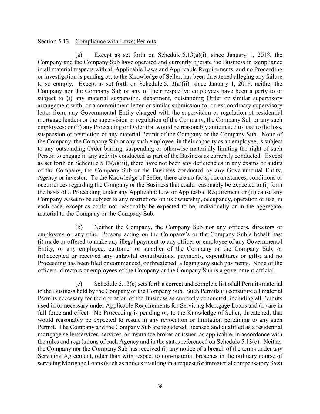 38 Section 5.13 Compliance with Laws; Permits. (a) Except as set forth on Schedule 5.13(a)(i), since January 1, 2018, the Company and the Company Sub have operated and currently operate the Business in compliance in all material respects with all Applicable Laws and Applicable Requirements, and no Proceeding or investigation is pending or, to the Knowledge of Seller, has been threatened alleging any failure to so comply. Except as set forth on Schedule 5.13(a)(ii), since January 1, 2018, neither the Company nor the Company Sub or any of their respective employees have been a party to or subject to (i) any material suspension, debarment, outstanding Order or similar supervisory arrangement with, or a commitment letter or similar submission to, or extraordinary supervisory letter from, any Governmental Entity charged with the supervision or regulation of residential mortgage lenders or the supervision or regulation of the Company, the Company Sub or any such employees; or (ii) any Proceeding or Order that would be reasonably anticipated to lead to the loss, suspension or restriction of any material Permit of the Company or the Company Sub. None of the Company, the Company Sub or any such employee, in their capacity as an employee, is subject to any outstanding Order barring, suspending or otherwise materially limiting the right of such Person to engage in any activity conducted as part of the Business as currently conducted. Except as set forth on Schedule 5.13(a)(iii), there have not been any deficiencies in any exams or audits of the Company, the Company Sub or the Business conducted by any Governmental Entity, Agency or investor. To the Knowledge of Seller, there are no facts, circumstances, conditions or occurrences regarding the Company or the Business that could reasonably be expected to (i) form the basis of a Proceeding under any Applicable Law or Applicable Requirement or (ii) cause any Company Asset to be subject to any restrictions on its ownership, occupancy, operation or use, in each case, except as could not reasonably be expected to be, individually or in the aggregate, material to the Company or the Company Sub. (b) Neither the Company, the Company Sub nor any officers, directors or employees or any other Persons acting on the Company’s or the Company Sub’s behalf has: (i) made or offered to make any illegal payment to any officer or employee of any Governmental Entity, or any employee, customer or supplier of the Company or the Company Sub, or (ii) accepted or received any unlawful contributions, payments, expenditures or gifts; and no Proceeding has been filed or commenced, or threatened, alleging any such payments. None of the officers, directors or employees of the Company or the Company Sub is a government official. (c) Schedule 5.13(c) sets forth a correct and complete list of all Permits material to the Business held by the Company or the Company Sub. Such Permits (i) constitute all material Permits necessary for the operation of the Business as currently conducted, including all Permits used in or necessary under Applicable Requirements for Servicing Mortgage Loans and (ii) are in full force and effect. No Proceeding is pending or, to the Knowledge of Seller, threatened, that would reasonably be expected to result in any revocation or limitation pertaining to any such Permit. The Company and the Company Sub are registered, licensed and qualified as a residential mortgage seller/servicer, servicer, or insurance broker or issuer, as applicable, in accordance with the rules and regulations of each Agency and in the states referenced on Schedule 5.13(c). Neither the Company nor the Company Sub has received (i) any notice of a breach of the terms under any Servicing Agreement, other than with respect to non-material breaches in the ordinary course of servicing Mortgage Loans (such as notices resulting in a request for immaterial compensatory fees)
