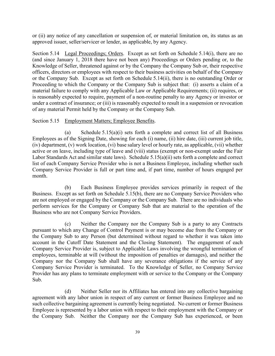 39 or (ii) any notice of any cancellation or suspension of, or material limitation on, its status as an approved issuer, seller/servicer or lender, as applicable, by any Agency. Section 5.14 Legal Proceedings; Orders. Except as set forth on Schedule 5.14(i), there are no (and since January 1, 2018 there have not been any) Proceedings or Orders pending or, to the Knowledge of Seller, threatened against or by the Company the Company Sub or, their respective officers, directors or employees with respect to their business activities on behalf of the Company or the Company Sub. Except as set forth on Schedule 5.14(ii), there is no outstanding Order or Proceeding to which the Company or the Company Sub is subject that: (i) asserts a claim of a material failure to comply with any Applicable Law or Applicable Requirements; (ii) requires, or is reasonably expected to require, payment of a non-routine penalty to any Agency or investor or under a contract of insurance; or (iii) is reasonably expected to result in a suspension or revocation of any material Permit held by the Company or the Company Sub. Section 5.15 Employment Matters; Employee Benefits. (a) Schedule 5.15(a)(i) sets forth a complete and correct list of all Business Employees as of the Signing Date, showing for each (i) name, (ii) hire date, (iii) current job title, (iv) department, (v) work location, (vi) base salary level or hourly rate, as applicable, (vii) whether active or on leave, including type of leave and (viii) status (exempt or non-exempt under the Fair Labor Standards Act and similar state laws). Schedule 5.15(a)(ii) sets forth a complete and correct list of each Company Service Provider who is not a Business Employee, including whether such Company Service Provider is full or part time and, if part time, number of hours engaged per month. (b) Each Business Employee provides services primarily in respect of the Business. Except as set forth on Schedule 5.15(b), there are no Company Service Providers who are not employed or engaged by the Company or the Company Sub. There are no individuals who perform services for the Company or Company Sub that are material to the operation of the Business who are not Company Service Providers. (c) Neither the Company nor the Company Sub is a party to any Contracts pursuant to which any Change of Control Payment is or may become due from the Company or the Company Sub to any Person (but determined without regard to whether it was taken into account in the Cutoff Date Statement and the Closing Statement). The engagement of each Company Service Provider is, subject to Applicable Laws involving the wrongful termination of employees, terminable at will (without the imposition of penalties or damages), and neither the Company nor the Company Sub shall have any severance obligations if the service of any Company Service Provider is terminated. To the Knowledge of Seller, no Company Service Provider has any plans to terminate employment with or service to the Company or the Company Sub. (d) Neither Seller nor its Affiliates has entered into any collective bargaining agreement with any labor union in respect of any current or former Business Employee and no such collective bargaining agreement is currently being negotiated. No current or former Business Employee is represented by a labor union with respect to their employment with the Company or the Company Sub. Neither the Company nor the Company Sub has experienced, or been