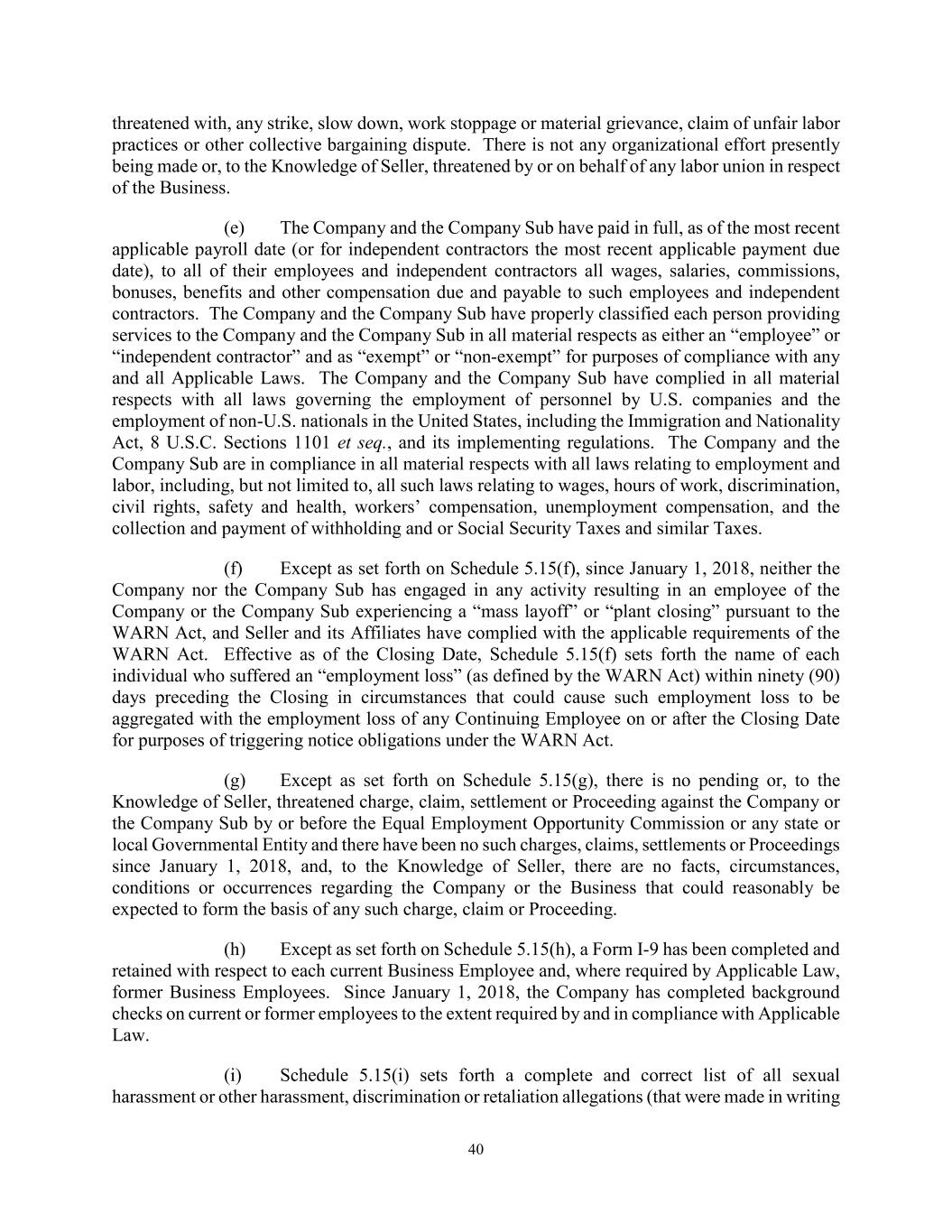 40 threatened with, any strike, slow down, work stoppage or material grievance, claim of unfair labor practices or other collective bargaining dispute. There is not any organizational effort presently being made or, to the Knowledge of Seller, threatened by or on behalf of any labor union in respect of the Business. (e) The Company and the Company Sub have paid in full, as of the most recent applicable payroll date (or for independent contractors the most recent applicable payment due date), to all of their employees and independent contractors all wages, salaries, commissions, bonuses, benefits and other compensation due and payable to such employees and independent contractors. The Company and the Company Sub have properly classified each person providing services to the Company and the Company Sub in all material respects as either an “employee” or “independent contractor” and as “exempt” or “non-exempt” for purposes of compliance with any and all Applicable Laws. The Company and the Company Sub have complied in all material respects with all laws governing the employment of personnel by U.S. companies and the employment of non-U.S. nationals in the United States, including the Immigration and Nationality Act, 8 U.S.C. Sections 1101 et seq., and its implementing regulations. The Company and the Company Sub are in compliance in all material respects with all laws relating to employment and labor, including, but not limited to, all such laws relating to wages, hours of work, discrimination, civil rights, safety and health, workers’ compensation, unemployment compensation, and the collection and payment of withholding and or Social Security Taxes and similar Taxes. (f) Except as set forth on Schedule 5.15(f), since January 1, 2018, neither the Company nor the Company Sub has engaged in any activity resulting in an employee of the Company or the Company Sub experiencing a “mass layoff” or “plant closing” pursuant to the WARN Act, and Seller and its Affiliates have complied with the applicable requirements of the WARN Act. Effective as of the Closing Date, Schedule 5.15(f) sets forth the name of each individual who suffered an “employment loss” (as defined by the WARN Act) within ninety (90) days preceding the Closing in circumstances that could cause such employment loss to be aggregated with the employment loss of any Continuing Employee on or after the Closing Date for purposes of triggering notice obligations under the WARN Act. (g) Except as set forth on Schedule 5.15(g), there is no pending or, to the Knowledge of Seller, threatened charge, claim, settlement or Proceeding against the Company or the Company Sub by or before the Equal Employment Opportunity Commission or any state or local Governmental Entity and there have been no such charges, claims, settlements or Proceedings since January 1, 2018, and, to the Knowledge of Seller, there are no facts, circumstances, conditions or occurrences regarding the Company or the Business that could reasonably be expected to form the basis of any such charge, claim or Proceeding. (h) Except as set forth on Schedule 5.15(h), a Form I-9 has been completed and retained with respect to each current Business Employee and, where required by Applicable Law, former Business Employees. Since January 1, 2018, the Company has completed background checks on current or former employees to the extent required by and in compliance with Applicable Law. (i) Schedule 5.15(i) sets forth a complete and correct list of all sexual harassment or other harassment, discrimination or retaliation allegations (that were made in writing