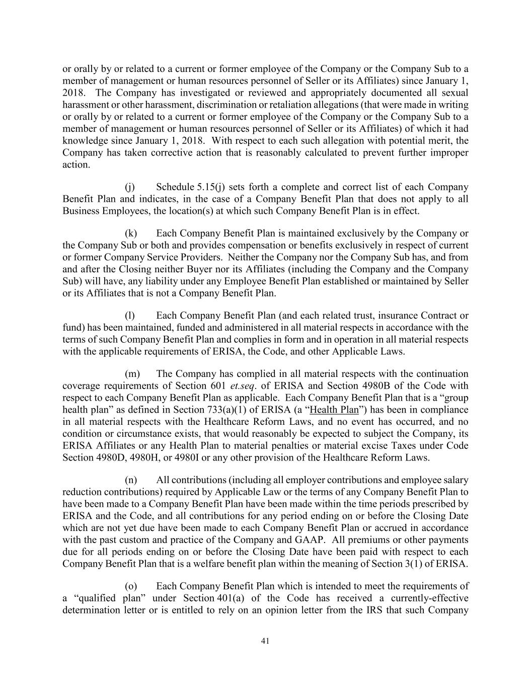 41 or orally by or related to a current or former employee of the Company or the Company Sub to a member of management or human resources personnel of Seller or its Affiliates) since January 1, 2018. The Company has investigated or reviewed and appropriately documented all sexual harassment or other harassment, discrimination or retaliation allegations (that were made in writing or orally by or related to a current or former employee of the Company or the Company Sub to a member of management or human resources personnel of Seller or its Affiliates) of which it had knowledge since January 1, 2018. With respect to each such allegation with potential merit, the Company has taken corrective action that is reasonably calculated to prevent further improper action. (j) Schedule 5.15(j) sets forth a complete and correct list of each Company Benefit Plan and indicates, in the case of a Company Benefit Plan that does not apply to all Business Employees, the location(s) at which such Company Benefit Plan is in effect. (k) Each Company Benefit Plan is maintained exclusively by the Company or the Company Sub or both and provides compensation or benefits exclusively in respect of current or former Company Service Providers. Neither the Company nor the Company Sub has, and from and after the Closing neither Buyer nor its Affiliates (including the Company and the Company Sub) will have, any liability under any Employee Benefit Plan established or maintained by Seller or its Affiliates that is not a Company Benefit Plan. (l) Each Company Benefit Plan (and each related trust, insurance Contract or fund) has been maintained, funded and administered in all material respects in accordance with the terms of such Company Benefit Plan and complies in form and in operation in all material respects with the applicable requirements of ERISA, the Code, and other Applicable Laws. (m) The Company has complied in all material respects with the continuation coverage requirements of Section 601 et.seq. of ERISA and Section 4980B of the Code with respect to each Company Benefit Plan as applicable. Each Company Benefit Plan that is a “group health plan” as defined in Section 733(a)(1) of ERISA (a “Health Plan”) has been in compliance in all material respects with the Healthcare Reform Laws, and no event has occurred, and no condition or circumstance exists, that would reasonably be expected to subject the Company, its ERISA Affiliates or any Health Plan to material penalties or material excise Taxes under Code Section 4980D, 4980H, or 4980I or any other provision of the Healthcare Reform Laws. (n) All contributions (including all employer contributions and employee salary reduction contributions) required by Applicable Law or the terms of any Company Benefit Plan to have been made to a Company Benefit Plan have been made within the time periods prescribed by ERISA and the Code, and all contributions for any period ending on or before the Closing Date which are not yet due have been made to each Company Benefit Plan or accrued in accordance with the past custom and practice of the Company and GAAP. All premiums or other payments due for all periods ending on or before the Closing Date have been paid with respect to each Company Benefit Plan that is a welfare benefit plan within the meaning of Section 3(1) of ERISA. (o) Each Company Benefit Plan which is intended to meet the requirements of a “qualified plan” under Section 401(a) of the Code has received a currently-effective determination letter or is entitled to rely on an opinion letter from the IRS that such Company