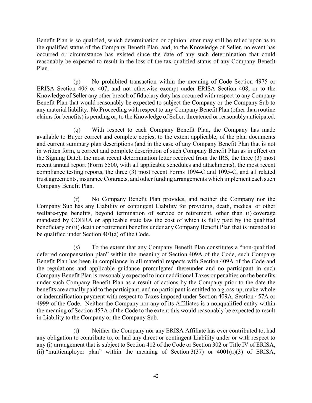 42 Benefit Plan is so qualified, which determination or opinion letter may still be relied upon as to the qualified status of the Company Benefit Plan, and, to the Knowledge of Seller, no event has occurred or circumstance has existed since the date of any such determination that could reasonably be expected to result in the loss of the tax-qualified status of any Company Benefit Plan.. (p) No prohibited transaction within the meaning of Code Section 4975 or ERISA Section 406 or 407, and not otherwise exempt under ERISA Section 408, or to the Knowledge of Seller any other breach of fiduciary duty has occurred with respect to any Company Benefit Plan that would reasonably be expected to subject the Company or the Company Sub to any material liability. No Proceeding with respect to any Company Benefit Plan (other than routine claims for benefits) is pending or, to the Knowledge of Seller, threatened or reasonably anticipated. (q) With respect to each Company Benefit Plan, the Company has made available to Buyer correct and complete copies, to the extent applicable, of the plan documents and current summary plan descriptions (and in the case of any Company Benefit Plan that is not in written form, a correct and complete description of such Company Benefit Plan as in effect on the Signing Date), the most recent determination letter received from the IRS, the three (3) most recent annual report (Form 5500, with all applicable schedules and attachments), the most recent compliance testing reports, the three (3) most recent Forms 1094-C and 1095-C, and all related trust agreements, insurance Contracts, and other funding arrangements which implement each such Company Benefit Plan. (r) No Company Benefit Plan provides, and neither the Company nor the Company Sub has any Liability or contingent Liability for providing, death, medical or other welfare-type benefits, beyond termination of service or retirement, other than (i) coverage mandated by COBRA or applicable state law the cost of which is fully paid by the qualified beneficiary or (ii) death or retirement benefits under any Company Benefit Plan that is intended to be qualified under Section 401(a) of the Code. (s) To the extent that any Company Benefit Plan constitutes a “non-qualified deferred compensation plan” within the meaning of Section 409A of the Code, such Company Benefit Plan has been in compliance in all material respects with Section 409A of the Code and the regulations and applicable guidance promulgated thereunder and no participant in such Company Benefit Plan is reasonably expected to incur additional Taxes or penalties on the benefits under such Company Benefit Plan as a result of actions by the Company prior to the date the benefits are actually paid to the participant, and no participant is entitled to a gross-up, make-whole or indemnification payment with respect to Taxes imposed under Section 409A, Section 457A or 4999 of the Code. Neither the Company nor any of its Affiliates is a nonqualified entity within the meaning of Section 457A of the Code to the extent this would reasonably be expected to result in Liability to the Company or the Company Sub. (t) Neither the Company nor any ERISA Affiliate has ever contributed to, had any obligation to contribute to, or had any direct or contingent Liability under or with respect to any (i) arrangement that is subject to Section 412 of the Code or Section 302 or Title IV of ERISA, (ii) “multiemployer plan” within the meaning of Section 3(37) or 4001(a)(3) of ERISA,