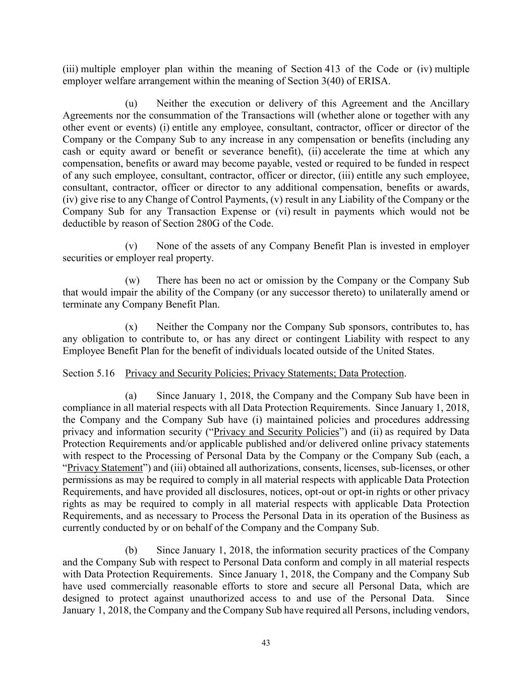 43 (iii) multiple employer plan within the meaning of Section 413 of the Code or (iv) multiple employer welfare arrangement within the meaning of Section 3(40) of ERISA. (u) Neither the execution or delivery of this Agreement and the Ancillary Agreements nor the consummation of the Transactions will (whether alone or together with any other event or events) (i) entitle any employee, consultant, contractor, officer or director of the Company or the Company Sub to any increase in any compensation or benefits (including any cash or equity award or benefit or severance benefit), (ii) accelerate the time at which any compensation, benefits or award may become payable, vested or required to be funded in respect of any such employee, consultant, contractor, officer or director, (iii) entitle any such employee, consultant, contractor, officer or director to any additional compensation, benefits or awards, (iv) give rise to any Change of Control Payments, (v) result in any Liability of the Company or the Company Sub for any Transaction Expense or (vi) result in payments which would not be deductible by reason of Section 280G of the Code. (v) None of the assets of any Company Benefit Plan is invested in employer securities or employer real property. (w) There has been no act or omission by the Company or the Company Sub that would impair the ability of the Company (or any successor thereto) to unilaterally amend or terminate any Company Benefit Plan. (x) Neither the Company nor the Company Sub sponsors, contributes to, has any obligation to contribute to, or has any direct or contingent Liability with respect to any Employee Benefit Plan for the benefit of individuals located outside of the United States. Section 5.16 Privacy and Security Policies; Privacy Statements; Data Protection. (a) Since January 1, 2018, the Company and the Company Sub have been in compliance in all material respects with all Data Protection Requirements. Since January 1, 2018, the Company and the Company Sub have (i) maintained policies and procedures addressing privacy and information security (“Privacy and Security Policies”) and (ii) as required by Data Protection Requirements and/or applicable published and/or delivered online privacy statements with respect to the Processing of Personal Data by the Company or the Company Sub (each, a “Privacy Statement”) and (iii) obtained all authorizations, consents, licenses, sub-licenses, or other permissions as may be required to comply in all material respects with applicable Data Protection Requirements, and have provided all disclosures, notices, opt-out or opt-in rights or other privacy rights as may be required to comply in all material respects with applicable Data Protection Requirements, and as necessary to Process the Personal Data in its operation of the Business as currently conducted by or on behalf of the Company and the Company Sub. (b) Since January 1, 2018, the information security practices of the Company and the Company Sub with respect to Personal Data conform and comply in all material respects with Data Protection Requirements. Since January 1, 2018, the Company and the Company Sub have used commercially reasonable efforts to store and secure all Personal Data, which are designed to protect against unauthorized access to and use of the Personal Data. Since January 1, 2018, the Company and the Company Sub have required all Persons, including vendors,