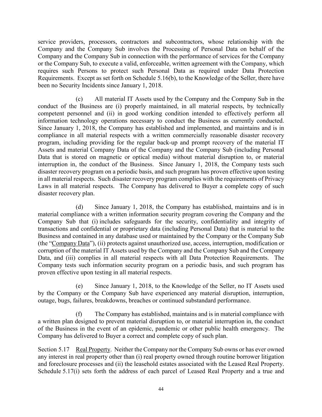44 service providers, processors, contractors and subcontractors, whose relationship with the Company and the Company Sub involves the Processing of Personal Data on behalf of the Company and the Company Sub in connection with the performance of services for the Company or the Company Sub, to execute a valid, enforceable, written agreement with the Company, which requires such Persons to protect such Personal Data as required under Data Protection Requirements. Except as set forth on Schedule 5.16(b), to the Knowledge of the Seller, there have been no Security Incidents since January 1, 2018. (c) All material IT Assets used by the Company and the Company Sub in the conduct of the Business are (i) properly maintained, in all material respects, by technically competent personnel and (ii) in good working condition intended to effectively perform all information technology operations necessary to conduct the Business as currently conducted. Since January 1, 2018, the Company has established and implemented, and maintains and is in compliance in all material respects with a written commercially reasonable disaster recovery program, including providing for the regular back-up and prompt recovery of the material IT Assets and material Company Data of the Company and the Company Sub (including Personal Data that is stored on magnetic or optical media) without material disruption to, or material interruption in, the conduct of the Business. Since January 1, 2018, the Company tests such disaster recovery program on a periodic basis, and such program has proven effective upon testing in all material respects. Such disaster recovery program complies with the requirements of Privacy Laws in all material respects. The Company has delivered to Buyer a complete copy of such disaster recovery plan. (d) Since January 1, 2018, the Company has established, maintains and is in material compliance with a written information security program covering the Company and the Company Sub that (i) includes safeguards for the security, confidentiality and integrity of transactions and confidential or proprietary data (including Personal Data) that is material to the Business and contained in any database used or maintained by the Company or the Company Sub (the “Company Data”), (ii) protects against unauthorized use, access, interruption, modification or corruption of the material IT Assets used by the Company and the Company Sub and the Company Data, and (iii) complies in all material respects with all Data Protection Requirements. The Company tests such information security program on a periodic basis, and such program has proven effective upon testing in all material respects. (e) Since January 1, 2018, to the Knowledge of the Seller, no IT Assets used by the Company or the Company Sub have experienced any material disruption, interruption, outage, bugs, failures, breakdowns, breaches or continued substandard performance. (f) The Company has established, maintains and is in material compliance with a written plan designed to prevent material disruption to, or material interruption in, the conduct of the Business in the event of an epidemic, pandemic or other public health emergency. The Company has delivered to Buyer a correct and complete copy of such plan. Section 5.17 Real Property. Neither the Company nor the Company Sub owns or has ever owned any interest in real property other than (i) real property owned through routine borrower litigation and foreclosure processes and (ii) the leasehold estates associated with the Leased Real Property. Schedule 5.17(i) sets forth the address of each parcel of Leased Real Property and a true and