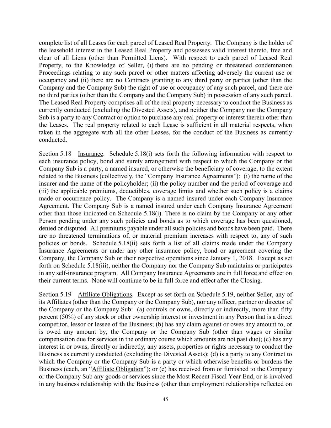 45 complete list of all Leases for each parcel of Leased Real Property. The Company is the holder of the leasehold interest in the Leased Real Property and possesses valid interest thereto, free and clear of all Liens (other than Permitted Liens). With respect to each parcel of Leased Real Property, to the Knowledge of Seller, (i) there are no pending or threatened condemnation Proceedings relating to any such parcel or other matters affecting adversely the current use or occupancy and (ii) there are no Contracts granting to any third party or parties (other than the Company and the Company Sub) the right of use or occupancy of any such parcel, and there are no third parties (other than the Company and the Company Sub) in possession of any such parcel. The Leased Real Property comprises all of the real property necessary to conduct the Business as currently conducted (excluding the Divested Assets), and neither the Company nor the Company Sub is a party to any Contract or option to purchase any real property or interest therein other than the Leases. The real property related to each Lease is sufficient in all material respects, when taken in the aggregate with all the other Leases, for the conduct of the Business as currently conducted. Section 5.18 Insurance. Schedule 5.18(i) sets forth the following information with respect to each insurance policy, bond and surety arrangement with respect to which the Company or the Company Sub is a party, a named insured, or otherwise the beneficiary of coverage, to the extent related to the Business (collectively, the “Company Insurance Agreements”): (i) the name of the insurer and the name of the policyholder; (ii) the policy number and the period of coverage and (iii) the applicable premiums, deductibles, coverage limits and whether such policy is a claims made or occurrence policy. The Company is a named insured under each Company Insurance Agreement. The Company Sub is a named insured under each Company Insurance Agreement other than those indicated on Schedule 5.18(i). There is no claim by the Company or any other Person pending under any such policies and bonds as to which coverage has been questioned, denied or disputed. All premiums payable under all such policies and bonds have been paid. There are no threatened terminations of, or material premium increases with respect to, any of such policies or bonds. Schedule 5.18(ii) sets forth a list of all claims made under the Company Insurance Agreements or under any other insurance policy, bond or agreement covering the Company, the Company Sub or their respective operations since January 1, 2018. Except as set forth on Schedule 5.18(iii), neither the Company nor the Company Sub maintains or participates in any self-insurance program. All Company Insurance Agreements are in full force and effect on their current terms. None will continue to be in full force and effect after the Closing. Section 5.19 Affiliate Obligations. Except as set forth on Schedule 5.19, neither Seller, any of its Affiliates (other than the Company or the Company Sub), nor any officer, partner or director of the Company or the Company Sub: (a) controls or owns, directly or indirectly, more than fifty percent (50%) of any stock or other ownership interest or investment in any Person that is a direct competitor, lessor or lessee of the Business; (b) has any claim against or owes any amount to, or is owed any amount by, the Company or the Company Sub (other than wages or similar compensation due for services in the ordinary course which amounts are not past due); (c) has any interest in or owns, directly or indirectly, any assets, properties or rights necessary to conduct the Business as currently conducted (excluding the Divested Assets); (d) is a party to any Contract to which the Company or the Company Sub is a party or which otherwise benefits or burdens the Business (each, an “Affiliate Obligation”); or (e) has received from or furnished to the Company or the Company Sub any goods or services since the Most Recent Fiscal Year End, or is involved in any business relationship with the Business (other than employment relationships reflected on