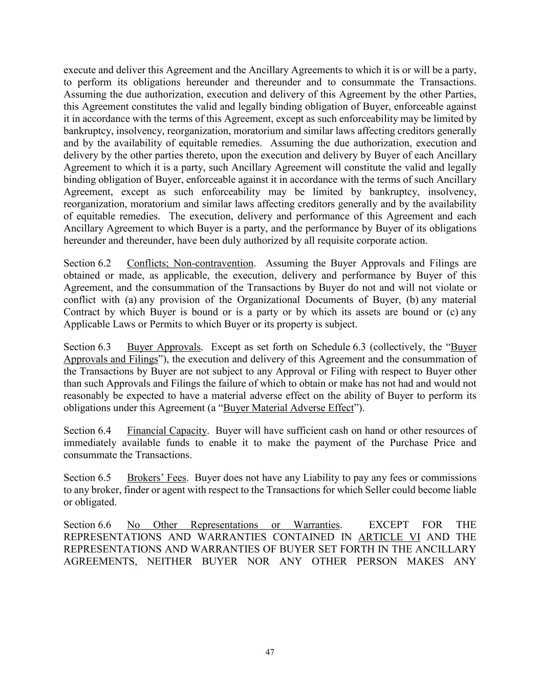 47 execute and deliver this Agreement and the Ancillary Agreements to which it is or will be a party, to perform its obligations hereunder and thereunder and to consummate the Transactions. Assuming the due authorization, execution and delivery of this Agreement by the other Parties, this Agreement constitutes the valid and legally binding obligation of Buyer, enforceable against it in accordance with the terms of this Agreement, except as such enforceability may be limited by bankruptcy, insolvency, reorganization, moratorium and similar laws affecting creditors generally and by the availability of equitable remedies. Assuming the due authorization, execution and delivery by the other parties thereto, upon the execution and delivery by Buyer of each Ancillary Agreement to which it is a party, such Ancillary Agreement will constitute the valid and legally binding obligation of Buyer, enforceable against it in accordance with the terms of such Ancillary Agreement, except as such enforceability may be limited by bankruptcy, insolvency, reorganization, moratorium and similar laws affecting creditors generally and by the availability of equitable remedies. The execution, delivery and performance of this Agreement and each Ancillary Agreement to which Buyer is a party, and the performance by Buyer of its obligations hereunder and thereunder, have been duly authorized by all requisite corporate action. Section 6.2 Conflicts; Non-contravention. Assuming the Buyer Approvals and Filings are obtained or made, as applicable, the execution, delivery and performance by Buyer of this Agreement, and the consummation of the Transactions by Buyer do not and will not violate or conflict with (a) any provision of the Organizational Documents of Buyer, (b) any material Contract by which Buyer is bound or is a party or by which its assets are bound or (c) any Applicable Laws or Permits to which Buyer or its property is subject. Section 6.3 Buyer Approvals. Except as set forth on Schedule 6.3 (collectively, the “Buyer Approvals and Filings”), the execution and delivery of this Agreement and the consummation of the Transactions by Buyer are not subject to any Approval or Filing with respect to Buyer other than such Approvals and Filings the failure of which to obtain or make has not had and would not reasonably be expected to have a material adverse effect on the ability of Buyer to perform its obligations under this Agreement (a “Buyer Material Adverse Effect”). Section 6.4 Financial Capacity. Buyer will have sufficient cash on hand or other resources of immediately available funds to enable it to make the payment of the Purchase Price and consummate the Transactions. Section 6.5 Brokers’ Fees. Buyer does not have any Liability to pay any fees or commissions to any broker, finder or agent with respect to the Transactions for which Seller could become liable or obligated. Section 6.6 No Other Representations or Warranties. EXCEPT FOR THE REPRESENTATIONS AND WARRANTIES CONTAINED IN ARTICLE VI AND THE REPRESENTATIONS AND WARRANTIES OF BUYER SET FORTH IN THE ANCILLARY AGREEMENTS, NEITHER BUYER NOR ANY OTHER PERSON MAKES ANY
