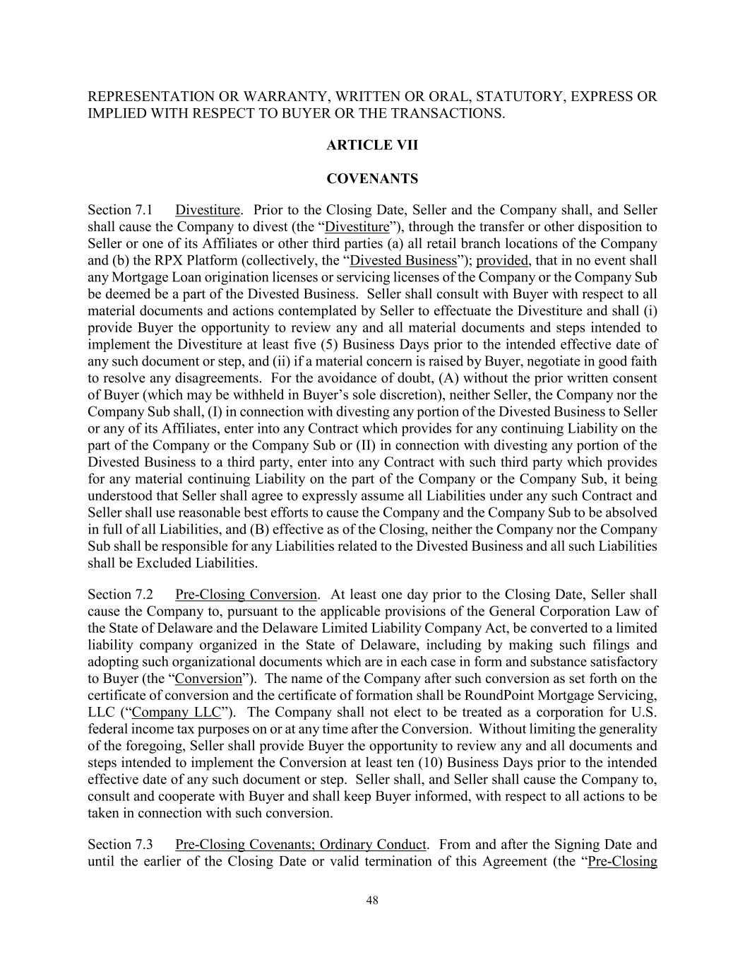 48 REPRESENTATION OR WARRANTY, WRITTEN OR ORAL, STATUTORY, EXPRESS OR IMPLIED WITH RESPECT TO BUYER OR THE TRANSACTIONS. ARTICLE VII COVENANTS Section 7.1 Divestiture. Prior to the Closing Date, Seller and the Company shall, and Seller shall cause the Company to divest (the “Divestiture”), through the transfer or other disposition to Seller or one of its Affiliates or other third parties (a) all retail branch locations of the Company and (b) the RPX Platform (collectively, the “Divested Business”); provided, that in no event shall any Mortgage Loan origination licenses or servicing licenses of the Company or the Company Sub be deemed be a part of the Divested Business. Seller shall consult with Buyer with respect to all material documents and actions contemplated by Seller to effectuate the Divestiture and shall (i) provide Buyer the opportunity to review any and all material documents and steps intended to implement the Divestiture at least five (5) Business Days prior to the intended effective date of any such document or step, and (ii) if a material concern is raised by Buyer, negotiate in good faith to resolve any disagreements. For the avoidance of doubt, (A) without the prior written consent of Buyer (which may be withheld in Buyer’s sole discretion), neither Seller, the Company nor the Company Sub shall, (I) in connection with divesting any portion of the Divested Business to Seller or any of its Affiliates, enter into any Contract which provides for any continuing Liability on the part of the Company or the Company Sub or (II) in connection with divesting any portion of the Divested Business to a third party, enter into any Contract with such third party which provides for any material continuing Liability on the part of the Company or the Company Sub, it being understood that Seller shall agree to expressly assume all Liabilities under any such Contract and Seller shall use reasonable best efforts to cause the Company and the Company Sub to be absolved in full of all Liabilities, and (B) effective as of the Closing, neither the Company nor the Company Sub shall be responsible for any Liabilities related to the Divested Business and all such Liabilities shall be Excluded Liabilities. Section 7.2 Pre-Closing Conversion. At least one day prior to the Closing Date, Seller shall cause the Company to, pursuant to the applicable provisions of the General Corporation Law of the State of Delaware and the Delaware Limited Liability Company Act, be converted to a limited liability company organized in the State of Delaware, including by making such filings and adopting such organizational documents which are in each case in form and substance satisfactory to Buyer (the “Conversion”). The name of the Company after such conversion as set forth on the certificate of conversion and the certificate of formation shall be RoundPoint Mortgage Servicing, LLC (“Company LLC”). The Company shall not elect to be treated as a corporation for U.S. federal income tax purposes on or at any time after the Conversion. Without limiting the generality of the foregoing, Seller shall provide Buyer the opportunity to review any and all documents and steps intended to implement the Conversion at least ten (10) Business Days prior to the intended effective date of any such document or step. Seller shall, and Seller shall cause the Company to, consult and cooperate with Buyer and shall keep Buyer informed, with respect to all actions to be taken in connection with such conversion. Section 7.3 Pre-Closing Covenants; Ordinary Conduct. From and after the Signing Date and until the earlier of the Closing Date or valid termination of this Agreement (the “Pre-Closing