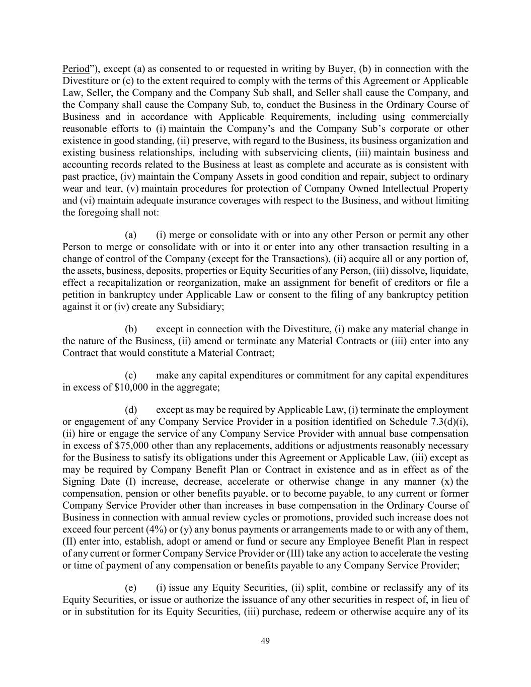 49 Period”), except (a) as consented to or requested in writing by Buyer, (b) in connection with the Divestiture or (c) to the extent required to comply with the terms of this Agreement or Applicable Law, Seller, the Company and the Company Sub shall, and Seller shall cause the Company, and the Company shall cause the Company Sub, to, conduct the Business in the Ordinary Course of Business and in accordance with Applicable Requirements, including using commercially reasonable efforts to (i) maintain the Company’s and the Company Sub’s corporate or other existence in good standing, (ii) preserve, with regard to the Business, its business organization and existing business relationships, including with subservicing clients, (iii) maintain business and accounting records related to the Business at least as complete and accurate as is consistent with past practice, (iv) maintain the Company Assets in good condition and repair, subject to ordinary wear and tear, (v) maintain procedures for protection of Company Owned Intellectual Property and (vi) maintain adequate insurance coverages with respect to the Business, and without limiting the foregoing shall not: (a) (i) merge or consolidate with or into any other Person or permit any other Person to merge or consolidate with or into it or enter into any other transaction resulting in a change of control of the Company (except for the Transactions), (ii) acquire all or any portion of, the assets, business, deposits, properties or Equity Securities of any Person, (iii) dissolve, liquidate, effect a recapitalization or reorganization, make an assignment for benefit of creditors or file a petition in bankruptcy under Applicable Law or consent to the filing of any bankruptcy petition against it or (iv) create any Subsidiary; (b) except in connection with the Divestiture, (i) make any material change in the nature of the Business, (ii) amend or terminate any Material Contracts or (iii) enter into any Contract that would constitute a Material Contract; (c) make any capital expenditures or commitment for any capital expenditures in excess of $10,000 in the aggregate; (d) except as may be required by Applicable Law, (i) terminate the employment or engagement of any Company Service Provider in a position identified on Schedule 7.3(d)(i), (ii) hire or engage the service of any Company Service Provider with annual base compensation in excess of $75,000 other than any replacements, additions or adjustments reasonably necessary for the Business to satisfy its obligations under this Agreement or Applicable Law, (iii) except as may be required by Company Benefit Plan or Contract in existence and as in effect as of the Signing Date (I) increase, decrease, accelerate or otherwise change in any manner (x) the compensation, pension or other benefits payable, or to become payable, to any current or former Company Service Provider other than increases in base compensation in the Ordinary Course of Business in connection with annual review cycles or promotions, provided such increase does not exceed four percent (4%) or (y) any bonus payments or arrangements made to or with any of them, (II) enter into, establish, adopt or amend or fund or secure any Employee Benefit Plan in respect of any current or former Company Service Provider or (III) take any action to accelerate the vesting or time of payment of any compensation or benefits payable to any Company Service Provider; (e) (i) issue any Equity Securities, (ii) split, combine or reclassify any of its Equity Securities, or issue or authorize the issuance of any other securities in respect of, in lieu of or in substitution for its Equity Securities, (iii) purchase, redeem or otherwise acquire any of its