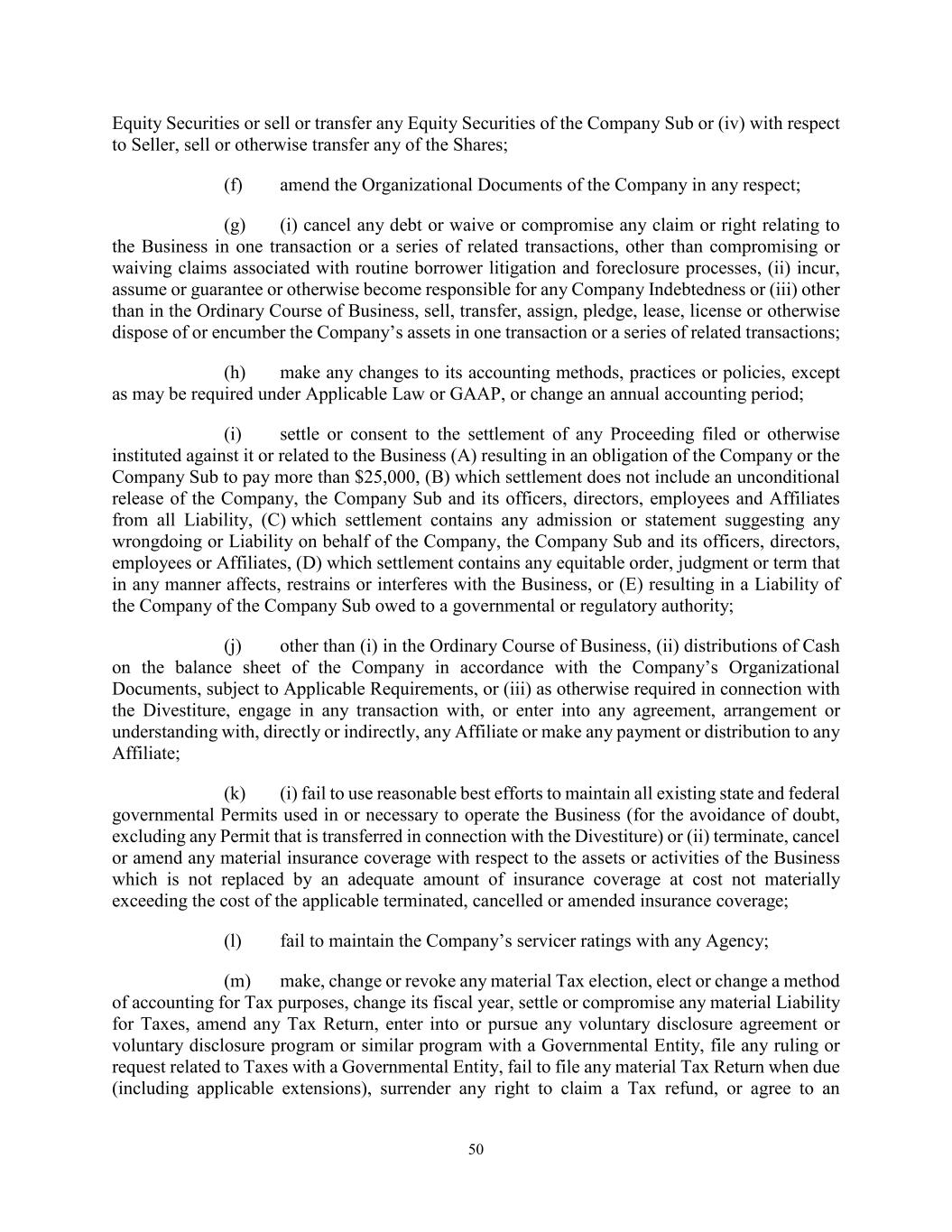 50 Equity Securities or sell or transfer any Equity Securities of the Company Sub or (iv) with respect to Seller, sell or otherwise transfer any of the Shares; (f) amend the Organizational Documents of the Company in any respect; (g) (i) cancel any debt or waive or compromise any claim or right relating to the Business in one transaction or a series of related transactions, other than compromising or waiving claims associated with routine borrower litigation and foreclosure processes, (ii) incur, assume or guarantee or otherwise become responsible for any Company Indebtedness or (iii) other than in the Ordinary Course of Business, sell, transfer, assign, pledge, lease, license or otherwise dispose of or encumber the Company’s assets in one transaction or a series of related transactions; (h) make any changes to its accounting methods, practices or policies, except as may be required under Applicable Law or GAAP, or change an annual accounting period; (i) settle or consent to the settlement of any Proceeding filed or otherwise instituted against it or related to the Business (A) resulting in an obligation of the Company or the Company Sub to pay more than $25,000, (B) which settlement does not include an unconditional release of the Company, the Company Sub and its officers, directors, employees and Affiliates from all Liability, (C) which settlement contains any admission or statement suggesting any wrongdoing or Liability on behalf of the Company, the Company Sub and its officers, directors, employees or Affiliates, (D) which settlement contains any equitable order, judgment or term that in any manner affects, restrains or interferes with the Business, or (E) resulting in a Liability of the Company of the Company Sub owed to a governmental or regulatory authority; (j) other than (i) in the Ordinary Course of Business, (ii) distributions of Cash on the balance sheet of the Company in accordance with the Company’s Organizational Documents, subject to Applicable Requirements, or (iii) as otherwise required in connection with the Divestiture, engage in any transaction with, or enter into any agreement, arrangement or understanding with, directly or indirectly, any Affiliate or make any payment or distribution to any Affiliate; (k) (i) fail to use reasonable best efforts to maintain all existing state and federal governmental Permits used in or necessary to operate the Business (for the avoidance of doubt, excluding any Permit that is transferred in connection with the Divestiture) or (ii) terminate, cancel or amend any material insurance coverage with respect to the assets or activities of the Business which is not replaced by an adequate amount of insurance coverage at cost not materially exceeding the cost of the applicable terminated, cancelled or amended insurance coverage; (l) fail to maintain the Company’s servicer ratings with any Agency; (m) make, change or revoke any material Tax election, elect or change a method of accounting for Tax purposes, change its fiscal year, settle or compromise any material Liability for Taxes, amend any Tax Return, enter into or pursue any voluntary disclosure agreement or voluntary disclosure program or similar program with a Governmental Entity, file any ruling or request related to Taxes with a Governmental Entity, fail to file any material Tax Return when due (including applicable extensions), surrender any right to claim a Tax refund, or agree to an