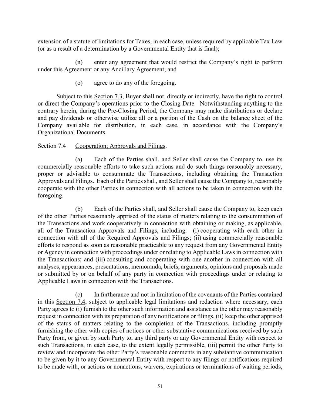 51 extension of a statute of limitations for Taxes, in each case, unless required by applicable Tax Law (or as a result of a determination by a Governmental Entity that is final); (n) enter any agreement that would restrict the Company’s right to perform under this Agreement or any Ancillary Agreement; and (o) agree to do any of the foregoing. Subject to this Section 7.3, Buyer shall not, directly or indirectly, have the right to control or direct the Company’s operations prior to the Closing Date. Notwithstanding anything to the contrary herein, during the Pre-Closing Period, the Company may make distributions or declare and pay dividends or otherwise utilize all or a portion of the Cash on the balance sheet of the Company available for distribution, in each case, in accordance with the Company’s Organizational Documents. Section 7.4 Cooperation; Approvals and Filings. (a) Each of the Parties shall, and Seller shall cause the Company to, use its commercially reasonable efforts to take such actions and do such things reasonably necessary, proper or advisable to consummate the Transactions, including obtaining the Transaction Approvals and Filings. Each of the Parties shall, and Seller shall cause the Company to, reasonably cooperate with the other Parties in connection with all actions to be taken in connection with the foregoing. (b) Each of the Parties shall, and Seller shall cause the Company to, keep each of the other Parties reasonably apprised of the status of matters relating to the consummation of the Transactions and work cooperatively in connection with obtaining or making, as applicable, all of the Transaction Approvals and Filings, including: (i) cooperating with each other in connection with all of the Required Approvals and Filings; (ii) using commercially reasonable efforts to respond as soon as reasonable practicable to any request from any Governmental Entity or Agency in connection with proceedings under or relating to Applicable Laws in connection with the Transactions; and (iii) consulting and cooperating with one another in connection with all analyses, appearances, presentations, memoranda, briefs, arguments, opinions and proposals made or submitted by or on behalf of any party in connection with proceedings under or relating to Applicable Laws in connection with the Transactions. (c) In furtherance and not in limitation of the covenants of the Parties contained in this Section 7.4, subject to applicable legal limitations and redaction where necessary, each Party agrees to (i) furnish to the other such information and assistance as the other may reasonably request in connection with its preparation of any notifications or filings, (ii) keep the other apprised of the status of matters relating to the completion of the Transactions, including promptly furnishing the other with copies of notices or other substantive communications received by such Party from, or given by such Party to, any third party or any Governmental Entity with respect to such Transactions, in each case, to the extent legally permissible, (iii) permit the other Party to review and incorporate the other Party’s reasonable comments in any substantive communication to be given by it to any Governmental Entity with respect to any filings or notifications required to be made with, or actions or nonactions, waivers, expirations or terminations of waiting periods,