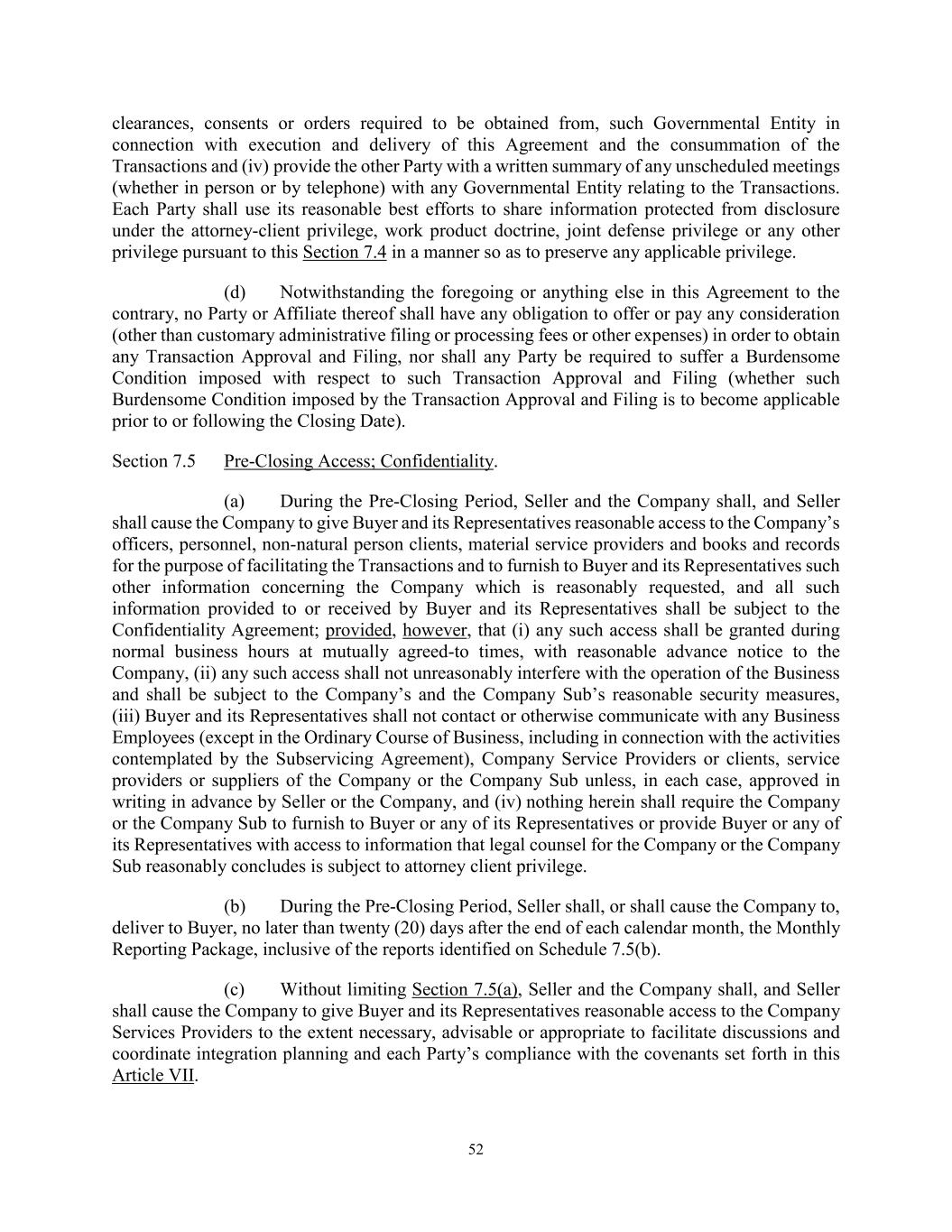 52 clearances, consents or orders required to be obtained from, such Governmental Entity in connection with execution and delivery of this Agreement and the consummation of the Transactions and (iv) provide the other Party with a written summary of any unscheduled meetings (whether in person or by telephone) with any Governmental Entity relating to the Transactions. Each Party shall use its reasonable best efforts to share information protected from disclosure under the attorney-client privilege, work product doctrine, joint defense privilege or any other privilege pursuant to this Section 7.4 in a manner so as to preserve any applicable privilege. (d) Notwithstanding the foregoing or anything else in this Agreement to the contrary, no Party or Affiliate thereof shall have any obligation to offer or pay any consideration (other than customary administrative filing or processing fees or other expenses) in order to obtain any Transaction Approval and Filing, nor shall any Party be required to suffer a Burdensome Condition imposed with respect to such Transaction Approval and Filing (whether such Burdensome Condition imposed by the Transaction Approval and Filing is to become applicable prior to or following the Closing Date). Section 7.5 Pre-Closing Access; Confidentiality. (a) During the Pre-Closing Period, Seller and the Company shall, and Seller shall cause the Company to give Buyer and its Representatives reasonable access to the Company’s officers, personnel, non-natural person clients, material service providers and books and records for the purpose of facilitating the Transactions and to furnish to Buyer and its Representatives such other information concerning the Company which is reasonably requested, and all such information provided to or received by Buyer and its Representatives shall be subject to the Confidentiality Agreement; provided, however, that (i) any such access shall be granted during normal business hours at mutually agreed-to times, with reasonable advance notice to the Company, (ii) any such access shall not unreasonably interfere with the operation of the Business and shall be subject to the Company’s and the Company Sub’s reasonable security measures, (iii) Buyer and its Representatives shall not contact or otherwise communicate with any Business Employees (except in the Ordinary Course of Business, including in connection with the activities contemplated by the Subservicing Agreement), Company Service Providers or clients, service providers or suppliers of the Company or the Company Sub unless, in each case, approved in writing in advance by Seller or the Company, and (iv) nothing herein shall require the Company or the Company Sub to furnish to Buyer or any of its Representatives or provide Buyer or any of its Representatives with access to information that legal counsel for the Company or the Company Sub reasonably concludes is subject to attorney client privilege. (b) During the Pre-Closing Period, Seller shall, or shall cause the Company to, deliver to Buyer, no later than twenty (20) days after the end of each calendar month, the Monthly Reporting Package, inclusive of the reports identified on Schedule 7.5(b). (c) Without limiting Section 7.5(a), Seller and the Company shall, and Seller shall cause the Company to give Buyer and its Representatives reasonable access to the Company Services Providers to the extent necessary, advisable or appropriate to facilitate discussions and coordinate integration planning and each Party’s compliance with the covenants set forth in this Article VII.