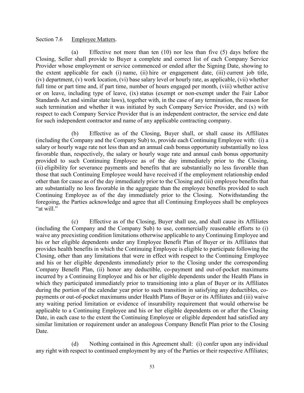 53 Section 7.6 Employee Matters. (a) Effective not more than ten (10) nor less than five (5) days before the Closing, Seller shall provide to Buyer a complete and correct list of each Company Service Provider whose employment or service commenced or ended after the Signing Date, showing to the extent applicable for each (i) name, (ii) hire or engagement date, (iii) current job title, (iv) department, (v) work location, (vi) base salary level or hourly rate, as applicable, (vii) whether full time or part time and, if part time, number of hours engaged per month, (viii) whether active or on leave, including type of leave, (ix) status (exempt or non-exempt under the Fair Labor Standards Act and similar state laws), together with, in the case of any termination, the reason for such termination and whether it was initiated by such Company Service Provider, and (x) with respect to each Company Service Provider that is an independent contractor, the service end date for such independent contractor and name of any applicable contracting company. (b) Effective as of the Closing, Buyer shall, or shall cause its Affiliates (including the Company and the Company Sub) to, provide each Continuing Employee with: (i) a salary or hourly wage rate not less than and an annual cash bonus opportunity substantially no less favorable than, respectively, the salary or hourly wage rate and annual cash bonus opportunity provided to such Continuing Employee as of the day immediately prior to the Closing, (ii) eligibility for severance payments and benefits that are substantially no less favorable than those that such Continuing Employee would have received if the employment relationship ended other than for cause as of the day immediately prior to the Closing and (iii) employee benefits that are substantially no less favorable in the aggregate than the employee benefits provided to such Continuing Employee as of the day immediately prior to the Closing. Notwithstanding the foregoing, the Parties acknowledge and agree that all Continuing Employees shall be employees “at will.” (c) Effective as of the Closing, Buyer shall use, and shall cause its Affiliates (including the Company and the Company Sub) to use, commercially reasonable efforts to (i) waive any preexisting condition limitations otherwise applicable to any Continuing Employee and his or her eligible dependents under any Employee Benefit Plan of Buyer or its Affiliates that provides health benefits in which the Continuing Employee is eligible to participate following the Closing, other than any limitations that were in effect with respect to the Continuing Employee and his or her eligible dependents immediately prior to the Closing under the corresponding Company Benefit Plan, (ii) honor any deductible, co-payment and out-of-pocket maximums incurred by a Continuing Employee and his or her eligible dependents under the Health Plans in which they participated immediately prior to transitioning into a plan of Buyer or its Affiliates during the portion of the calendar year prior to such transition in satisfying any deductibles, co- payments or out-of-pocket maximums under Health Plans of Buyer or its Affiliates and (iii) waive any waiting period limitation or evidence of insurability requirement that would otherwise be applicable to a Continuing Employee and his or her eligible dependents on or after the Closing Date, in each case to the extent the Continuing Employee or eligible dependent had satisfied any similar limitation or requirement under an analogous Company Benefit Plan prior to the Closing Date. (d) Nothing contained in this Agreement shall: (i) confer upon any individual any right with respect to continued employment by any of the Parties or their respective Affiliates;