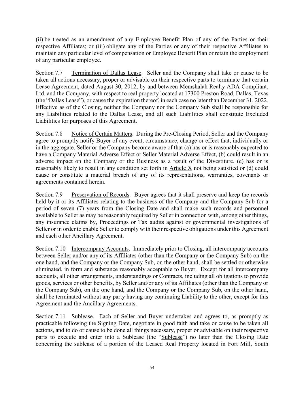 54 (ii) be treated as an amendment of any Employee Benefit Plan of any of the Parties or their respective Affiliates; or (iii) obligate any of the Parties or any of their respective Affiliates to maintain any particular level of compensation or Employee Benefit Plan or retain the employment of any particular employee. Section 7.7 Termination of Dallas Lease. Seller and the Company shall take or cause to be taken all actions necessary, proper or advisable on their respective parts to terminate that certain Lease Agreement, dated August 30, 2012, by and between Memshalah Realty ADA Compliant, Ltd. and the Company, with respect to real property located at 17300 Preston Road, Dallas, Texas (the “Dallas Lease”), or cause the expiration thereof, in each case no later than December 31, 2022. Effective as of the Closing, neither the Company nor the Company Sub shall be responsible for any Liabilities related to the Dallas Lease, and all such Liabilities shall constitute Excluded Liabilities for purposes of this Agreement. Section 7.8 Notice of Certain Matters. During the Pre-Closing Period, Seller and the Company agree to promptly notify Buyer of any event, circumstance, change or effect that, individually or in the aggregate, Seller or the Company become aware of that (a) has or is reasonably expected to have a Company Material Adverse Effect or Seller Material Adverse Effect, (b) could result in an adverse impact on the Company or the Business as a result of the Divestiture, (c) has or is reasonably likely to result in any condition set forth in Article X not being satisfied or (d) could cause or constitute a material breach of any of its representations, warranties, covenants or agreements contained herein. Section 7.9 Preservation of Records. Buyer agrees that it shall preserve and keep the records held by it or its Affiliates relating to the business of the Company and the Company Sub for a period of seven (7) years from the Closing Date and shall make such records and personnel available to Seller as may be reasonably required by Seller in connection with, among other things, any insurance claims by, Proceedings or Tax audits against or governmental investigations of Seller or in order to enable Seller to comply with their respective obligations under this Agreement and each other Ancillary Agreement. Section 7.10 Intercompany Accounts. Immediately prior to Closing, all intercompany accounts between Seller and/or any of its Affiliates (other than the Company or the Company Sub) on the one hand, and the Company or the Company Sub, on the other hand, shall be settled or otherwise eliminated, in form and substance reasonably acceptable to Buyer. Except for all intercompany accounts, all other arrangements, understandings or Contracts, including all obligations to provide goods, services or other benefits, by Seller and/or any of its Affiliates (other than the Company or the Company Sub), on the one hand, and the Company or the Company Sub, on the other hand, shall be terminated without any party having any continuing Liability to the other, except for this Agreement and the Ancillary Agreements. Section 7.11 Sublease. Each of Seller and Buyer undertakes and agrees to, as promptly as practicable following the Signing Date, negotiate in good faith and take or cause to be taken all actions, and to do or cause to be done all things necessary, proper or advisable on their respective parts to execute and enter into a Sublease (the “Sublease”) no later than the Closing Date concerning the sublease of a portion of the Leased Real Property located in Fort Mill, South