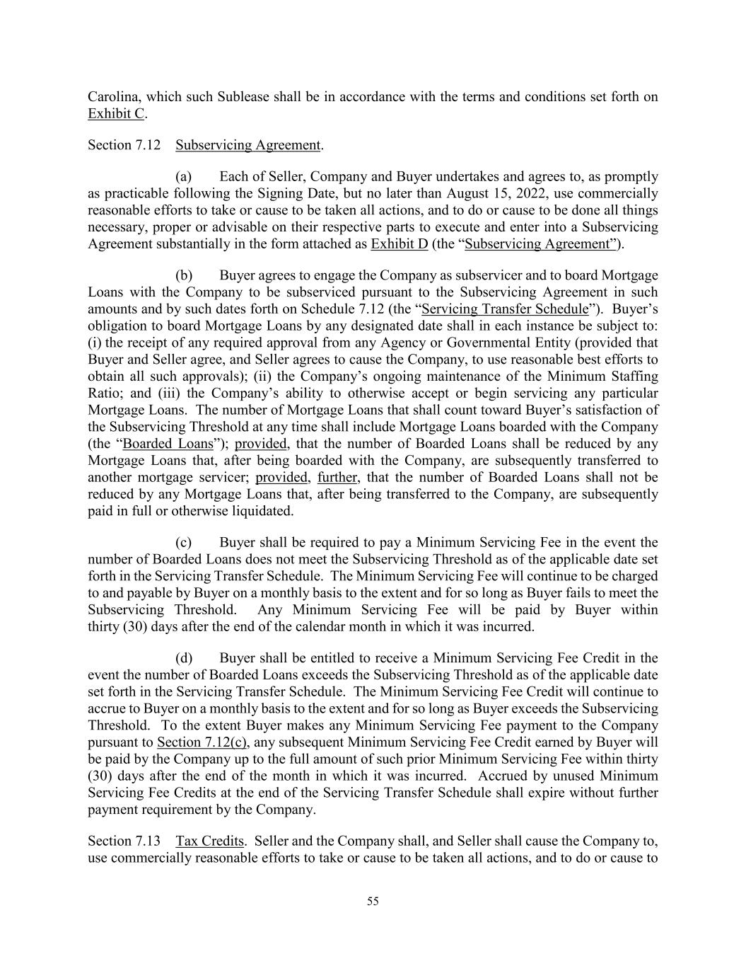 55 Carolina, which such Sublease shall be in accordance with the terms and conditions set forth on Exhibit C. Section 7.12 Subservicing Agreement. (a) Each of Seller, Company and Buyer undertakes and agrees to, as promptly as practicable following the Signing Date, but no later than August 15, 2022, use commercially reasonable efforts to take or cause to be taken all actions, and to do or cause to be done all things necessary, proper or advisable on their respective parts to execute and enter into a Subservicing Agreement substantially in the form attached as Exhibit D (the “Subservicing Agreement”). (b) Buyer agrees to engage the Company as subservicer and to board Mortgage Loans with the Company to be subserviced pursuant to the Subservicing Agreement in such amounts and by such dates forth on Schedule 7.12 (the “Servicing Transfer Schedule”). Buyer’s obligation to board Mortgage Loans by any designated date shall in each instance be subject to: (i) the receipt of any required approval from any Agency or Governmental Entity (provided that Buyer and Seller agree, and Seller agrees to cause the Company, to use reasonable best efforts to obtain all such approvals); (ii) the Company’s ongoing maintenance of the Minimum Staffing Ratio; and (iii) the Company’s ability to otherwise accept or begin servicing any particular Mortgage Loans. The number of Mortgage Loans that shall count toward Buyer’s satisfaction of the Subservicing Threshold at any time shall include Mortgage Loans boarded with the Company (the “Boarded Loans”); provided, that the number of Boarded Loans shall be reduced by any Mortgage Loans that, after being boarded with the Company, are subsequently transferred to another mortgage servicer; provided, further, that the number of Boarded Loans shall not be reduced by any Mortgage Loans that, after being transferred to the Company, are subsequently paid in full or otherwise liquidated. (c) Buyer shall be required to pay a Minimum Servicing Fee in the event the number of Boarded Loans does not meet the Subservicing Threshold as of the applicable date set forth in the Servicing Transfer Schedule. The Minimum Servicing Fee will continue to be charged to and payable by Buyer on a monthly basis to the extent and for so long as Buyer fails to meet the Subservicing Threshold. Any Minimum Servicing Fee will be paid by Buyer within thirty (30) days after the end of the calendar month in which it was incurred. (d) Buyer shall be entitled to receive a Minimum Servicing Fee Credit in the event the number of Boarded Loans exceeds the Subservicing Threshold as of the applicable date set forth in the Servicing Transfer Schedule. The Minimum Servicing Fee Credit will continue to accrue to Buyer on a monthly basis to the extent and for so long as Buyer exceeds the Subservicing Threshold. To the extent Buyer makes any Minimum Servicing Fee payment to the Company pursuant to Section 7.12(c), any subsequent Minimum Servicing Fee Credit earned by Buyer will be paid by the Company up to the full amount of such prior Minimum Servicing Fee within thirty (30) days after the end of the month in which it was incurred. Accrued by unused Minimum Servicing Fee Credits at the end of the Servicing Transfer Schedule shall expire without further payment requirement by the Company. Section 7.13 Tax Credits. Seller and the Company shall, and Seller shall cause the Company to, use commercially reasonable efforts to take or cause to be taken all actions, and to do or cause to