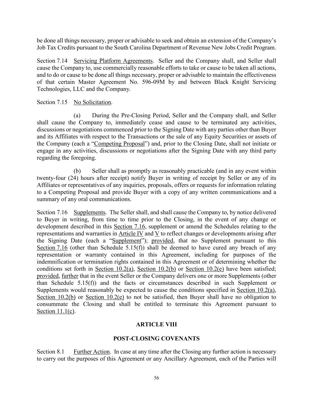 56 be done all things necessary, proper or advisable to seek and obtain an extension of the Company’s Job Tax Credits pursuant to the South Carolina Department of Revenue New Jobs Credit Program. Section 7.14 Servicing Platform Agreements. Seller and the Company shall, and Seller shall cause the Company to, use commercially reasonable efforts to take or cause to be taken all actions, and to do or cause to be done all things necessary, proper or advisable to maintain the effectiveness of that certain Master Agreement No. 596-09M by and between Black Knight Servicing Technologies, LLC and the Company. Section 7.15 No Solicitation. (a) During the Pre-Closing Period, Seller and the Company shall, and Seller shall cause the Company to, immediately cease and cause to be terminated any activities, discussions or negotiations commenced prior to the Signing Date with any parties other than Buyer and its Affiliates with respect to the Transactions or the sale of any Equity Securities or assets of the Company (each a “Competing Proposal”) and, prior to the Closing Date, shall not initiate or engage in any activities, discussions or negotiations after the Signing Date with any third party regarding the foregoing. (b) Seller shall as promptly as reasonably practicable (and in any event within twenty-four (24) hours after receipt) notify Buyer in writing of receipt by Seller or any of its Affiliates or representatives of any inquiries, proposals, offers or requests for information relating to a Competing Proposal and provide Buyer with a copy of any written communications and a summary of any oral communications. Section 7.16 Supplements. The Seller shall, and shall cause the Company to, by notice delivered to Buyer in writing, from time to time prior to the Closing, in the event of any change or development described in this Section 7.16, supplement or amend the Schedules relating to the representations and warranties in Article IV and V to reflect changes or developments arising after the Signing Date (each a “Supplement”); provided, that no Supplement pursuant to this Section 7.16 (other than Schedule 5.15(f)) shall be deemed to have cured any breach of any representation or warranty contained in this Agreement, including for purposes of the indemnification or termination rights contained in this Agreement or of determining whether the conditions set forth in Section 10.2(a), Section 10.2(b) or Section 10.2(e) have been satisfied; provided, further that in the event Seller or the Company delivers one or more Supplements (other than Schedule 5.15(f)) and the facts or circumstances described in such Supplement or Supplements would reasonably be expected to cause the conditions specified in Section 10.2(a), Section 10.2(b) or Section 10.2(e) to not be satisfied, then Buyer shall have no obligation to consummate the Closing and shall be entitled to terminate this Agreement pursuant to Section 11.1(c). ARTICLE VIII POST-CLOSING COVENANTS Section 8.1 Further Action. In case at any time after the Closing any further action is necessary to carry out the purposes of this Agreement or any Ancillary Agreement, each of the Parties will