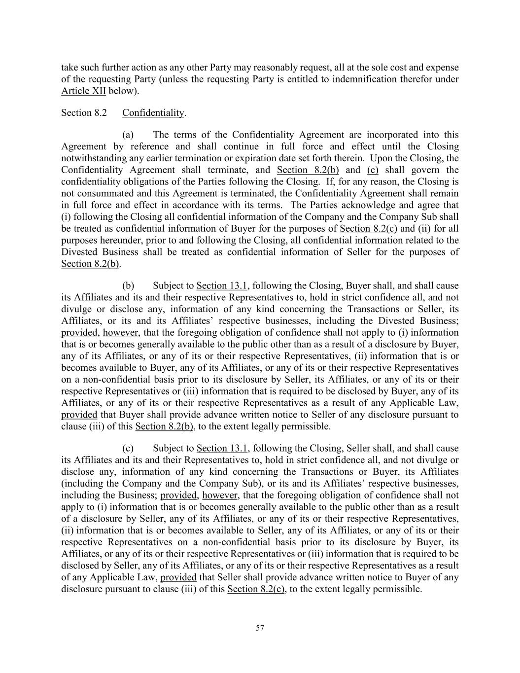 57 take such further action as any other Party may reasonably request, all at the sole cost and expense of the requesting Party (unless the requesting Party is entitled to indemnification therefor under Article XII below). Section 8.2 Confidentiality. (a) The terms of the Confidentiality Agreement are incorporated into this Agreement by reference and shall continue in full force and effect until the Closing notwithstanding any earlier termination or expiration date set forth therein. Upon the Closing, the Confidentiality Agreement shall terminate, and Section 8.2(b) and (c) shall govern the confidentiality obligations of the Parties following the Closing. If, for any reason, the Closing is not consummated and this Agreement is terminated, the Confidentiality Agreement shall remain in full force and effect in accordance with its terms. The Parties acknowledge and agree that (i) following the Closing all confidential information of the Company and the Company Sub shall be treated as confidential information of Buyer for the purposes of Section 8.2(c) and (ii) for all purposes hereunder, prior to and following the Closing, all confidential information related to the Divested Business shall be treated as confidential information of Seller for the purposes of Section 8.2(b). (b) Subject to Section 13.1, following the Closing, Buyer shall, and shall cause its Affiliates and its and their respective Representatives to, hold in strict confidence all, and not divulge or disclose any, information of any kind concerning the Transactions or Seller, its Affiliates, or its and its Affiliates’ respective businesses, including the Divested Business; provided, however, that the foregoing obligation of confidence shall not apply to (i) information that is or becomes generally available to the public other than as a result of a disclosure by Buyer, any of its Affiliates, or any of its or their respective Representatives, (ii) information that is or becomes available to Buyer, any of its Affiliates, or any of its or their respective Representatives on a non-confidential basis prior to its disclosure by Seller, its Affiliates, or any of its or their respective Representatives or (iii) information that is required to be disclosed by Buyer, any of its Affiliates, or any of its or their respective Representatives as a result of any Applicable Law, provided that Buyer shall provide advance written notice to Seller of any disclosure pursuant to clause (iii) of this Section 8.2(b), to the extent legally permissible. (c) Subject to Section 13.1, following the Closing, Seller shall, and shall cause its Affiliates and its and their Representatives to, hold in strict confidence all, and not divulge or disclose any, information of any kind concerning the Transactions or Buyer, its Affiliates (including the Company and the Company Sub), or its and its Affiliates’ respective businesses, including the Business; provided, however, that the foregoing obligation of confidence shall not apply to (i) information that is or becomes generally available to the public other than as a result of a disclosure by Seller, any of its Affiliates, or any of its or their respective Representatives, (ii) information that is or becomes available to Seller, any of its Affiliates, or any of its or their respective Representatives on a non-confidential basis prior to its disclosure by Buyer, its Affiliates, or any of its or their respective Representatives or (iii) information that is required to be disclosed by Seller, any of its Affiliates, or any of its or their respective Representatives as a result of any Applicable Law, provided that Seller shall provide advance written notice to Buyer of any disclosure pursuant to clause (iii) of this Section 8.2(c), to the extent legally permissible.