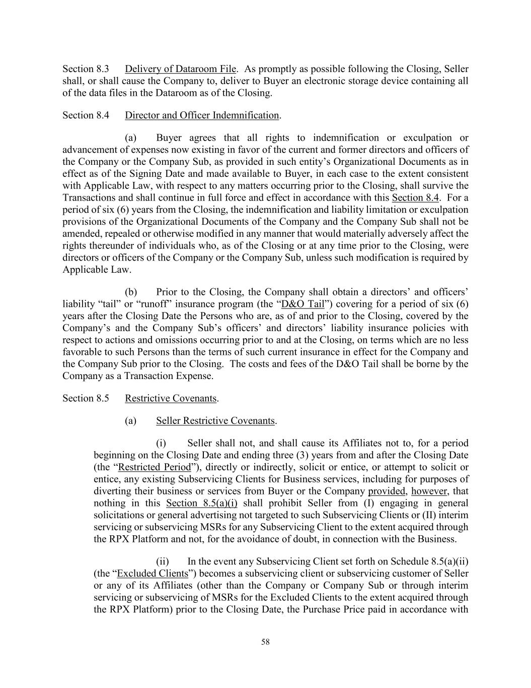 58 Section 8.3 Delivery of Dataroom File. As promptly as possible following the Closing, Seller shall, or shall cause the Company to, deliver to Buyer an electronic storage device containing all of the data files in the Dataroom as of the Closing. Section 8.4 Director and Officer Indemnification. (a) Buyer agrees that all rights to indemnification or exculpation or advancement of expenses now existing in favor of the current and former directors and officers of the Company or the Company Sub, as provided in such entity’s Organizational Documents as in effect as of the Signing Date and made available to Buyer, in each case to the extent consistent with Applicable Law, with respect to any matters occurring prior to the Closing, shall survive the Transactions and shall continue in full force and effect in accordance with this Section 8.4. For a period of six (6) years from the Closing, the indemnification and liability limitation or exculpation provisions of the Organizational Documents of the Company and the Company Sub shall not be amended, repealed or otherwise modified in any manner that would materially adversely affect the rights thereunder of individuals who, as of the Closing or at any time prior to the Closing, were directors or officers of the Company or the Company Sub, unless such modification is required by Applicable Law. (b) Prior to the Closing, the Company shall obtain a directors’ and officers’ liability “tail” or “runoff” insurance program (the “D&O Tail”) covering for a period of six (6) years after the Closing Date the Persons who are, as of and prior to the Closing, covered by the Company’s and the Company Sub’s officers’ and directors’ liability insurance policies with respect to actions and omissions occurring prior to and at the Closing, on terms which are no less favorable to such Persons than the terms of such current insurance in effect for the Company and the Company Sub prior to the Closing. The costs and fees of the D&O Tail shall be borne by the Company as a Transaction Expense. Section 8.5 Restrictive Covenants. (a) Seller Restrictive Covenants. (i) Seller shall not, and shall cause its Affiliates not to, for a period beginning on the Closing Date and ending three (3) years from and after the Closing Date (the “Restricted Period”), directly or indirectly, solicit or entice, or attempt to solicit or entice, any existing Subservicing Clients for Business services, including for purposes of diverting their business or services from Buyer or the Company provided, however, that nothing in this Section 8.5(a)(i) shall prohibit Seller from (I) engaging in general solicitations or general advertising not targeted to such Subservicing Clients or (II) interim servicing or subservicing MSRs for any Subservicing Client to the extent acquired through the RPX Platform and not, for the avoidance of doubt, in connection with the Business. (ii) In the event any Subservicing Client set forth on Schedule 8.5(a)(ii) (the “Excluded Clients”) becomes a subservicing client or subservicing customer of Seller or any of its Affiliates (other than the Company or Company Sub or through interim servicing or subservicing of MSRs for the Excluded Clients to the extent acquired through the RPX Platform) prior to the Closing Date, the Purchase Price paid in accordance with