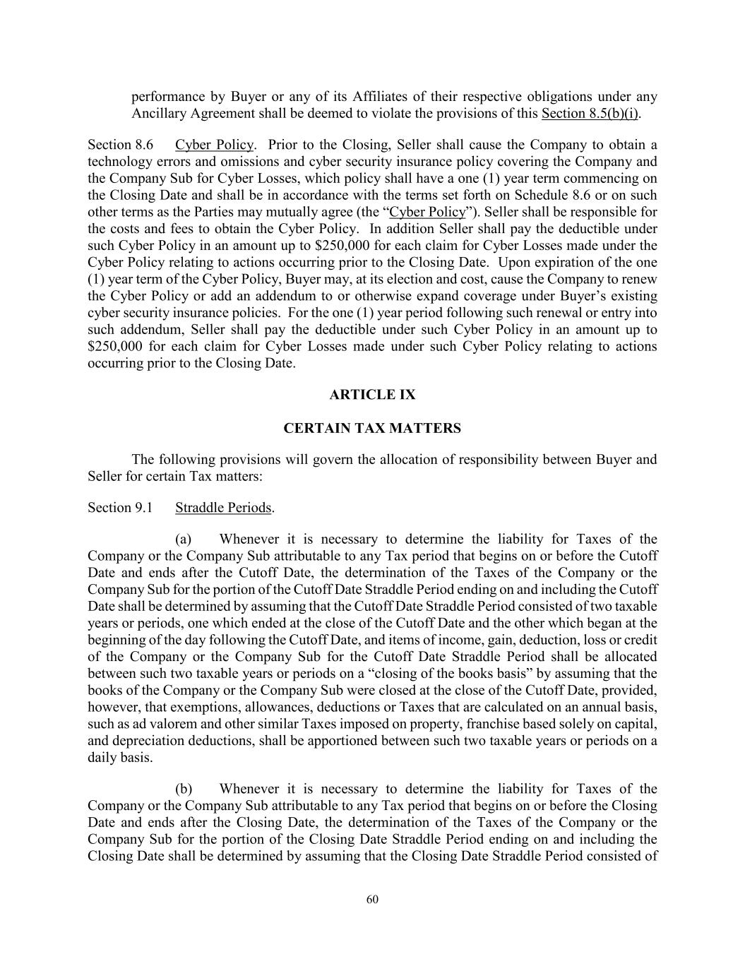 60 performance by Buyer or any of its Affiliates of their respective obligations under any Ancillary Agreement shall be deemed to violate the provisions of this Section 8.5(b)(i). Section 8.6 Cyber Policy. Prior to the Closing, Seller shall cause the Company to obtain a technology errors and omissions and cyber security insurance policy covering the Company and the Company Sub for Cyber Losses, which policy shall have a one (1) year term commencing on the Closing Date and shall be in accordance with the terms set forth on Schedule 8.6 or on such other terms as the Parties may mutually agree (the “Cyber Policy”). Seller shall be responsible for the costs and fees to obtain the Cyber Policy. In addition Seller shall pay the deductible under such Cyber Policy in an amount up to $250,000 for each claim for Cyber Losses made under the Cyber Policy relating to actions occurring prior to the Closing Date. Upon expiration of the one (1) year term of the Cyber Policy, Buyer may, at its election and cost, cause the Company to renew the Cyber Policy or add an addendum to or otherwise expand coverage under Buyer’s existing cyber security insurance policies. For the one (1) year period following such renewal or entry into such addendum, Seller shall pay the deductible under such Cyber Policy in an amount up to $250,000 for each claim for Cyber Losses made under such Cyber Policy relating to actions occurring prior to the Closing Date. ARTICLE IX CERTAIN TAX MATTERS The following provisions will govern the allocation of responsibility between Buyer and Seller for certain Tax matters: Section 9.1 Straddle Periods. (a) Whenever it is necessary to determine the liability for Taxes of the Company or the Company Sub attributable to any Tax period that begins on or before the Cutoff Date and ends after the Cutoff Date, the determination of the Taxes of the Company or the Company Sub for the portion of the Cutoff Date Straddle Period ending on and including the Cutoff Date shall be determined by assuming that the Cutoff Date Straddle Period consisted of two taxable years or periods, one which ended at the close of the Cutoff Date and the other which began at the beginning of the day following the Cutoff Date, and items of income, gain, deduction, loss or credit of the Company or the Company Sub for the Cutoff Date Straddle Period shall be allocated between such two taxable years or periods on a “closing of the books basis” by assuming that the books of the Company or the Company Sub were closed at the close of the Cutoff Date, provided, however, that exemptions, allowances, deductions or Taxes that are calculated on an annual basis, such as ad valorem and other similar Taxes imposed on property, franchise based solely on capital, and depreciation deductions, shall be apportioned between such two taxable years or periods on a daily basis. (b) Whenever it is necessary to determine the liability for Taxes of the Company or the Company Sub attributable to any Tax period that begins on or before the Closing Date and ends after the Closing Date, the determination of the Taxes of the Company or the Company Sub for the portion of the Closing Date Straddle Period ending on and including the Closing Date shall be determined by assuming that the Closing Date Straddle Period consisted of
