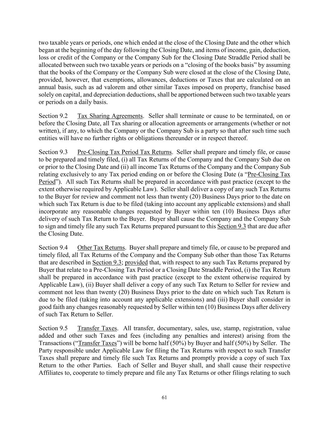61 two taxable years or periods, one which ended at the close of the Closing Date and the other which began at the beginning of the day following the Closing Date, and items of income, gain, deduction, loss or credit of the Company or the Company Sub for the Closing Date Straddle Period shall be allocated between such two taxable years or periods on a “closing of the books basis” by assuming that the books of the Company or the Company Sub were closed at the close of the Closing Date, provided, however, that exemptions, allowances, deductions or Taxes that are calculated on an annual basis, such as ad valorem and other similar Taxes imposed on property, franchise based solely on capital, and depreciation deductions, shall be apportioned between such two taxable years or periods on a daily basis. Section 9.2 Tax Sharing Agreements. Seller shall terminate or cause to be terminated, on or before the Closing Date, all Tax sharing or allocation agreements or arrangements (whether or not written), if any, to which the Company or the Company Sub is a party so that after such time such entities will have no further rights or obligations thereunder or in respect thereof. Section 9.3 Pre-Closing Tax Period Tax Returns. Seller shall prepare and timely file, or cause to be prepared and timely filed, (i) all Tax Returns of the Company and the Company Sub due on or prior to the Closing Date and (ii) all income Tax Returns of the Company and the Company Sub relating exclusively to any Tax period ending on or before the Closing Date (a “Pre-Closing Tax Period”). All such Tax Returns shall be prepared in accordance with past practice (except to the extent otherwise required by Applicable Law). Seller shall deliver a copy of any such Tax Returns to the Buyer for review and comment not less than twenty (20) Business Days prior to the date on which such Tax Return is due to be filed (taking into account any applicable extensions) and shall incorporate any reasonable changes requested by Buyer within ten (10) Business Days after delivery of such Tax Return to the Buyer. Buyer shall cause the Company and the Company Sub to sign and timely file any such Tax Returns prepared pursuant to this Section 9.3 that are due after the Closing Date. Section 9.4 Other Tax Returns. Buyer shall prepare and timely file, or cause to be prepared and timely filed, all Tax Returns of the Company and the Company Sub other than those Tax Returns that are described in Section 9.3; provided that, with respect to any such Tax Returns prepared by Buyer that relate to a Pre-Closing Tax Period or a Closing Date Straddle Period, (i) the Tax Return shall be prepared in accordance with past practice (except to the extent otherwise required by Applicable Law), (ii) Buyer shall deliver a copy of any such Tax Return to Seller for review and comment not less than twenty (20) Business Days prior to the date on which such Tax Return is due to be filed (taking into account any applicable extensions) and (iii) Buyer shall consider in good faith any changes reasonably requested by Seller within ten (10) Business Days after delivery of such Tax Return to Seller. Section 9.5 Transfer Taxes. All transfer, documentary, sales, use, stamp, registration, value added and other such Taxes and fees (including any penalties and interest) arising from the Transactions (“Transfer Taxes”) will be borne half (50%) by Buyer and half (50%) by Seller. The Party responsible under Applicable Law for filing the Tax Returns with respect to such Transfer Taxes shall prepare and timely file such Tax Returns and promptly provide a copy of such Tax Return to the other Parties. Each of Seller and Buyer shall, and shall cause their respective Affiliates to, cooperate to timely prepare and file any Tax Returns or other filings relating to such