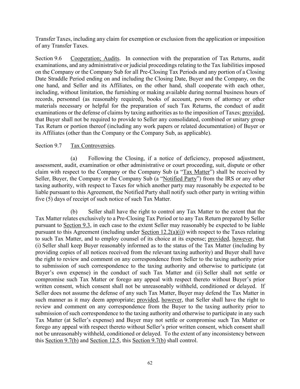 62 Transfer Taxes, including any claim for exemption or exclusion from the application or imposition of any Transfer Taxes. Section 9.6 Cooperation; Audits. In connection with the preparation of Tax Returns, audit examinations, and any administrative or judicial proceedings relating to the Tax liabilities imposed on the Company or the Company Sub for all Pre-Closing Tax Periods and any portion of a Closing Date Straddle Period ending on and including the Closing Date, Buyer and the Company, on the one hand, and Seller and its Affiliates, on the other hand, shall cooperate with each other, including, without limitation, the furnishing or making available during normal business hours of records, personnel (as reasonably required), books of account, powers of attorney or other materials necessary or helpful for the preparation of such Tax Returns, the conduct of audit examinations or the defense of claims by taxing authorities as to the imposition of Taxes; provided, that Buyer shall not be required to provide to Seller any consolidated, combined or unitary group Tax Return or portion thereof (including any work papers or related documentation) of Buyer or its Affiliates (other than the Company or the Company Sub, as applicable). Section 9.7 Tax Controversies. (a) Following the Closing, if a notice of deficiency, proposed adjustment, assessment, audit, examination or other administrative or court proceeding, suit, dispute or other claim with respect to the Company or the Company Sub (a “Tax Matter”) shall be received by Seller, Buyer, the Company or the Company Sub (a “Notified Party”) from the IRS or any other taxing authority, with respect to Taxes for which another party may reasonably be expected to be liable pursuant to this Agreement, the Notified Party shall notify such other party in writing within five (5) days of receipt of such notice of such Tax Matter. (b) Seller shall have the right to control any Tax Matter to the extent that the Tax Matter relates exclusively to a Pre-Closing Tax Period or to any Tax Return prepared by Seller pursuant to Section 9.3, in each case to the extent Seller may reasonably be expected to be liable pursuant to this Agreement (including under Section 12.2(a)(i)) with respect to the Taxes relating to such Tax Matter, and to employ counsel of its choice at its expense; provided, however, that (i) Seller shall keep Buyer reasonably informed as to the status of the Tax Matter (including by providing copies of all notices received from the relevant taxing authority) and Buyer shall have the right to review and comment on any correspondence from Seller to the taxing authority prior to submission of such correspondence to the taxing authority and otherwise to participate (at Buyer’s own expense) in the conduct of such Tax Matter and (ii) Seller shall not settle or compromise such Tax Matter or forego any appeal with respect thereto without Buyer’s prior written consent, which consent shall not be unreasonably withheld, conditioned or delayed. If Seller does not assume the defense of any such Tax Matter, Buyer may defend the Tax Matter in such manner as it may deem appropriate; provided, however, that Seller shall have the right to review and comment on any correspondence from the Buyer to the taxing authority prior to submission of such correspondence to the taxing authority and otherwise to participate in any such Tax Matter (at Seller’s expense) and Buyer may not settle or compromise such Tax Matter or forego any appeal with respect thereto without Seller’s prior written consent, which consent shall not be unreasonably withheld, conditioned or delayed. To the extent of any inconsistency between this Section 9.7(b) and Section 12.5, this Section 9.7(b) shall control.