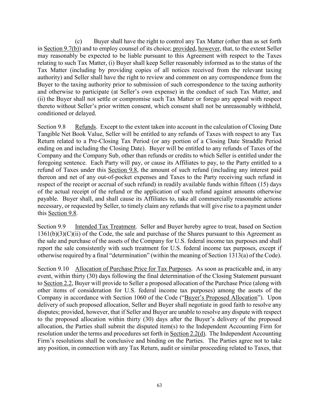 63 (c) Buyer shall have the right to control any Tax Matter (other than as set forth in Section 9.7(b)) and to employ counsel of its choice; provided, however, that, to the extent Seller may reasonably be expected to be liable pursuant to this Agreement with respect to the Taxes relating to such Tax Matter, (i) Buyer shall keep Seller reasonably informed as to the status of the Tax Matter (including by providing copies of all notices received from the relevant taxing authority) and Seller shall have the right to review and comment on any correspondence from the Buyer to the taxing authority prior to submission of such correspondence to the taxing authority and otherwise to participate (at Seller’s own expense) in the conduct of such Tax Matter, and (ii) the Buyer shall not settle or compromise such Tax Matter or forego any appeal with respect thereto without Seller’s prior written consent, which consent shall not be unreasonably withheld, conditioned or delayed. Section 9.8 Refunds. Except to the extent taken into account in the calculation of Closing Date Tangible Net Book Value, Seller will be entitled to any refunds of Taxes with respect to any Tax Return related to a Pre-Closing Tax Period (or any portion of a Closing Date Straddle Period ending on and including the Closing Date). Buyer will be entitled to any refunds of Taxes of the Company and the Company Sub, other than refunds or credits to which Seller is entitled under the foregoing sentence. Each Party will pay, or cause its Affiliates to pay, to the Party entitled to a refund of Taxes under this Section 9.8, the amount of such refund (including any interest paid thereon and net of any out-of-pocket expenses and Taxes to the Party receiving such refund in respect of the receipt or accrual of such refund) in readily available funds within fifteen (15) days of the actual receipt of the refund or the application of such refund against amounts otherwise payable. Buyer shall, and shall cause its Affiliates to, take all commercially reasonable actions necessary, or requested by Seller, to timely claim any refunds that will give rise to a payment under this Section 9.8. Section 9.9 Intended Tax Treatment. Seller and Buyer hereby agree to treat, based on Section 1361(b)(3)(C)(ii) of the Code, the sale and purchase of the Shares pursuant to this Agreement as the sale and purchase of the assets of the Company for U.S. federal income tax purposes and shall report the sale consistently with such treatment for U.S. federal income tax purposes, except if otherwise required by a final “determination” (within the meaning of Section 1313(a) of the Code). Section 9.10 Allocation of Purchase Price for Tax Purposes. As soon as practicable and, in any event, within thirty (30) days following the final determination of the Closing Statement pursuant to Section 2.2, Buyer will provide to Seller a proposed allocation of the Purchase Price (along with other items of consideration for U.S. federal income tax purposes) among the assets of the Company in accordance with Section 1060 of the Code (“Buyer’s Proposed Allocation”). Upon delivery of such proposed allocation, Seller and Buyer shall negotiate in good faith to resolve any disputes; provided, however, that if Seller and Buyer are unable to resolve any dispute with respect to the proposed allocation within thirty (30) days after the Buyer’s delivery of the proposed allocation, the Parties shall submit the disputed item(s) to the Independent Accounting Firm for resolution under the terms and procedures set forth in Section 2.2(d). The Independent Accounting Firm’s resolutions shall be conclusive and binding on the Parties. The Parties agree not to take any position, in connection with any Tax Return, audit or similar proceeding related to Taxes, that
