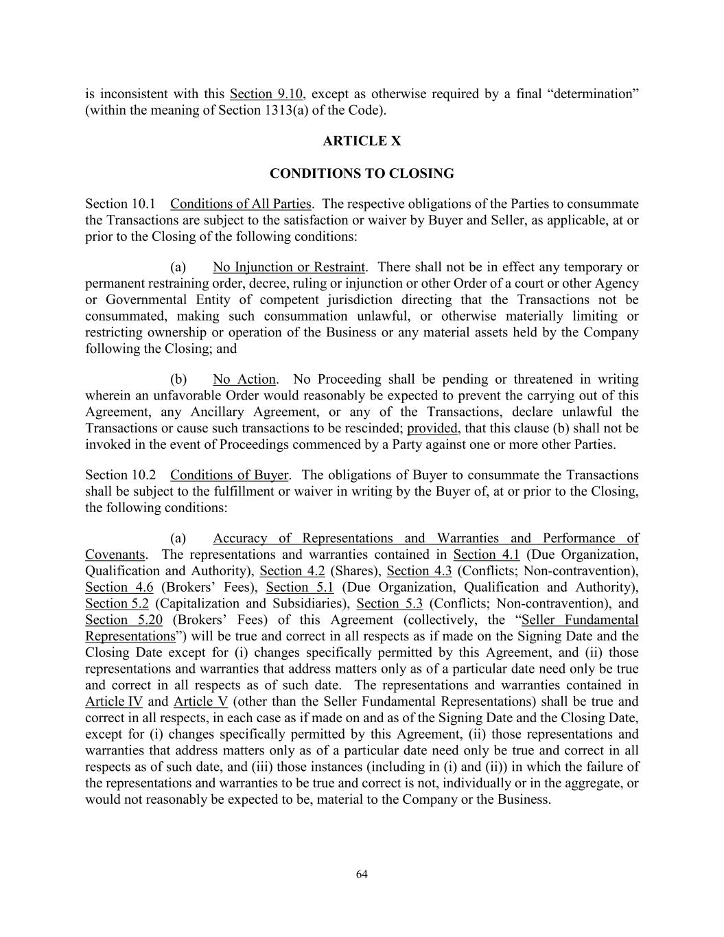 64 is inconsistent with this Section 9.10, except as otherwise required by a final “determination” (within the meaning of Section 1313(a) of the Code). ARTICLE X CONDITIONS TO CLOSING Section 10.1 Conditions of All Parties. The respective obligations of the Parties to consummate the Transactions are subject to the satisfaction or waiver by Buyer and Seller, as applicable, at or prior to the Closing of the following conditions: (a) No Injunction or Restraint. There shall not be in effect any temporary or permanent restraining order, decree, ruling or injunction or other Order of a court or other Agency or Governmental Entity of competent jurisdiction directing that the Transactions not be consummated, making such consummation unlawful, or otherwise materially limiting or restricting ownership or operation of the Business or any material assets held by the Company following the Closing; and (b) No Action. No Proceeding shall be pending or threatened in writing wherein an unfavorable Order would reasonably be expected to prevent the carrying out of this Agreement, any Ancillary Agreement, or any of the Transactions, declare unlawful the Transactions or cause such transactions to be rescinded; provided, that this clause (b) shall not be invoked in the event of Proceedings commenced by a Party against one or more other Parties. Section 10.2 Conditions of Buyer. The obligations of Buyer to consummate the Transactions shall be subject to the fulfillment or waiver in writing by the Buyer of, at or prior to the Closing, the following conditions: (a) Accuracy of Representations and Warranties and Performance of Covenants. The representations and warranties contained in Section 4.1 (Due Organization, Qualification and Authority), Section 4.2 (Shares), Section 4.3 (Conflicts; Non-contravention), Section 4.6 (Brokers’ Fees), Section 5.1 (Due Organization, Qualification and Authority), Section 5.2 (Capitalization and Subsidiaries), Section 5.3 (Conflicts; Non-contravention), and Section 5.20 (Brokers’ Fees) of this Agreement (collectively, the “Seller Fundamental Representations”) will be true and correct in all respects as if made on the Signing Date and the Closing Date except for (i) changes specifically permitted by this Agreement, and (ii) those representations and warranties that address matters only as of a particular date need only be true and correct in all respects as of such date. The representations and warranties contained in Article IV and Article V (other than the Seller Fundamental Representations) shall be true and correct in all respects, in each case as if made on and as of the Signing Date and the Closing Date, except for (i) changes specifically permitted by this Agreement, (ii) those representations and warranties that address matters only as of a particular date need only be true and correct in all respects as of such date, and (iii) those instances (including in (i) and (ii)) in which the failure of the representations and warranties to be true and correct is not, individually or in the aggregate, or would not reasonably be expected to be, material to the Company or the Business.