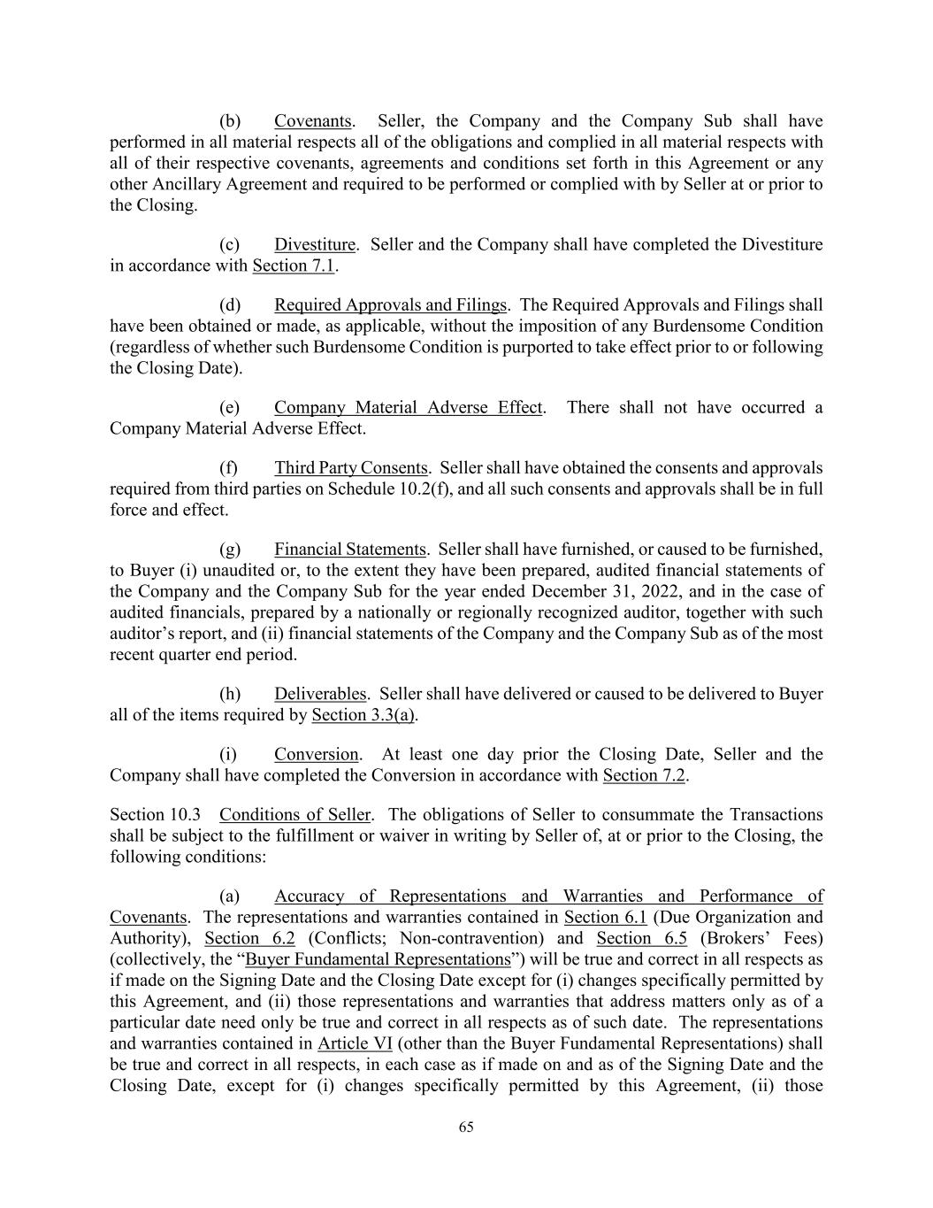 65 (b) Covenants. Seller, the Company and the Company Sub shall have performed in all material respects all of the obligations and complied in all material respects with all of their respective covenants, agreements and conditions set forth in this Agreement or any other Ancillary Agreement and required to be performed or complied with by Seller at or prior to the Closing. (c) Divestiture. Seller and the Company shall have completed the Divestiture in accordance with Section 7.1. (d) Required Approvals and Filings. The Required Approvals and Filings shall have been obtained or made, as applicable, without the imposition of any Burdensome Condition (regardless of whether such Burdensome Condition is purported to take effect prior to or following the Closing Date). (e) Company Material Adverse Effect. There shall not have occurred a Company Material Adverse Effect. (f) Third Party Consents. Seller shall have obtained the consents and approvals required from third parties on Schedule 10.2(f), and all such consents and approvals shall be in full force and effect. (g) Financial Statements. Seller shall have furnished, or caused to be furnished, to Buyer (i) unaudited or, to the extent they have been prepared, audited financial statements of the Company and the Company Sub for the year ended December 31, 2022, and in the case of audited financials, prepared by a nationally or regionally recognized auditor, together with such auditor’s report, and (ii) financial statements of the Company and the Company Sub as of the most recent quarter end period. (h) Deliverables. Seller shall have delivered or caused to be delivered to Buyer all of the items required by Section 3.3(a). (i) Conversion. At least one day prior the Closing Date, Seller and the Company shall have completed the Conversion in accordance with Section 7.2. Section 10.3 Conditions of Seller. The obligations of Seller to consummate the Transactions shall be subject to the fulfillment or waiver in writing by Seller of, at or prior to the Closing, the following conditions: (a) Accuracy of Representations and Warranties and Performance of Covenants. The representations and warranties contained in Section 6.1 (Due Organization and Authority), Section 6.2 (Conflicts; Non-contravention) and Section 6.5 (Brokers’ Fees) (collectively, the “Buyer Fundamental Representations”) will be true and correct in all respects as if made on the Signing Date and the Closing Date except for (i) changes specifically permitted by this Agreement, and (ii) those representations and warranties that address matters only as of a particular date need only be true and correct in all respects as of such date. The representations and warranties contained in Article VI (other than the Buyer Fundamental Representations) shall be true and correct in all respects, in each case as if made on and as of the Signing Date and the Closing Date, except for (i) changes specifically permitted by this Agreement, (ii) those