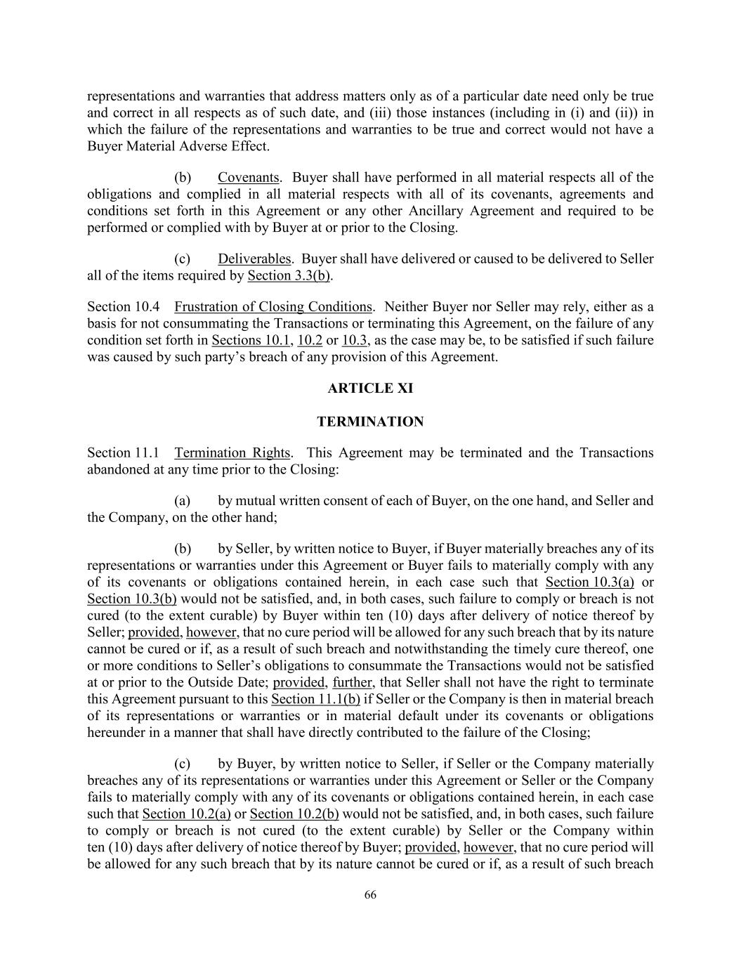 66 representations and warranties that address matters only as of a particular date need only be true and correct in all respects as of such date, and (iii) those instances (including in (i) and (ii)) in which the failure of the representations and warranties to be true and correct would not have a Buyer Material Adverse Effect. (b) Covenants. Buyer shall have performed in all material respects all of the obligations and complied in all material respects with all of its covenants, agreements and conditions set forth in this Agreement or any other Ancillary Agreement and required to be performed or complied with by Buyer at or prior to the Closing. (c) Deliverables. Buyer shall have delivered or caused to be delivered to Seller all of the items required by Section 3.3(b). Section 10.4 Frustration of Closing Conditions. Neither Buyer nor Seller may rely, either as a basis for not consummating the Transactions or terminating this Agreement, on the failure of any condition set forth in Sections 10.1, 10.2 or 10.3, as the case may be, to be satisfied if such failure was caused by such party’s breach of any provision of this Agreement. ARTICLE XI TERMINATION Section 11.1 Termination Rights. This Agreement may be terminated and the Transactions abandoned at any time prior to the Closing: (a) by mutual written consent of each of Buyer, on the one hand, and Seller and the Company, on the other hand; (b) by Seller, by written notice to Buyer, if Buyer materially breaches any of its representations or warranties under this Agreement or Buyer fails to materially comply with any of its covenants or obligations contained herein, in each case such that Section 10.3(a) or Section 10.3(b) would not be satisfied, and, in both cases, such failure to comply or breach is not cured (to the extent curable) by Buyer within ten (10) days after delivery of notice thereof by Seller; provided, however, that no cure period will be allowed for any such breach that by its nature cannot be cured or if, as a result of such breach and notwithstanding the timely cure thereof, one or more conditions to Seller’s obligations to consummate the Transactions would not be satisfied at or prior to the Outside Date; provided, further, that Seller shall not have the right to terminate this Agreement pursuant to this Section 11.1(b) if Seller or the Company is then in material breach of its representations or warranties or in material default under its covenants or obligations hereunder in a manner that shall have directly contributed to the failure of the Closing; (c) by Buyer, by written notice to Seller, if Seller or the Company materially breaches any of its representations or warranties under this Agreement or Seller or the Company fails to materially comply with any of its covenants or obligations contained herein, in each case such that Section 10.2(a) or Section 10.2(b) would not be satisfied, and, in both cases, such failure to comply or breach is not cured (to the extent curable) by Seller or the Company within ten (10) days after delivery of notice thereof by Buyer; provided, however, that no cure period will be allowed for any such breach that by its nature cannot be cured or if, as a result of such breach