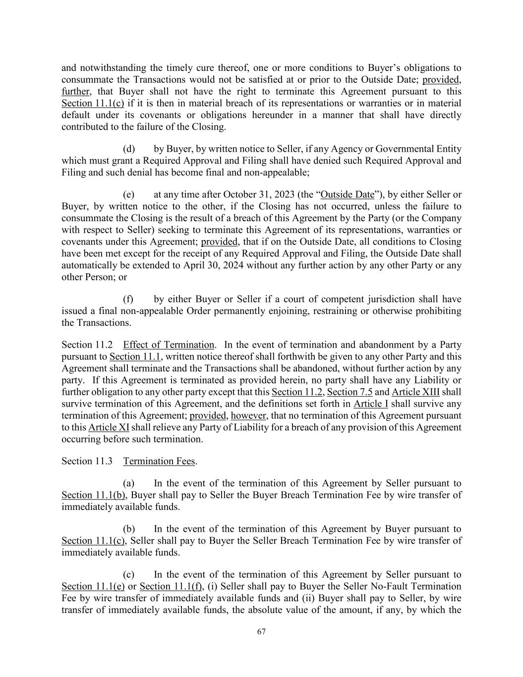 67 and notwithstanding the timely cure thereof, one or more conditions to Buyer’s obligations to consummate the Transactions would not be satisfied at or prior to the Outside Date; provided, further, that Buyer shall not have the right to terminate this Agreement pursuant to this Section 11.1(c) if it is then in material breach of its representations or warranties or in material default under its covenants or obligations hereunder in a manner that shall have directly contributed to the failure of the Closing. (d) by Buyer, by written notice to Seller, if any Agency or Governmental Entity which must grant a Required Approval and Filing shall have denied such Required Approval and Filing and such denial has become final and non-appealable; (e) at any time after October 31, 2023 (the “Outside Date”), by either Seller or Buyer, by written notice to the other, if the Closing has not occurred, unless the failure to consummate the Closing is the result of a breach of this Agreement by the Party (or the Company with respect to Seller) seeking to terminate this Agreement of its representations, warranties or covenants under this Agreement; provided, that if on the Outside Date, all conditions to Closing have been met except for the receipt of any Required Approval and Filing, the Outside Date shall automatically be extended to April 30, 2024 without any further action by any other Party or any other Person; or (f) by either Buyer or Seller if a court of competent jurisdiction shall have issued a final non-appealable Order permanently enjoining, restraining or otherwise prohibiting the Transactions. Section 11.2 Effect of Termination. In the event of termination and abandonment by a Party pursuant to Section 11.1, written notice thereof shall forthwith be given to any other Party and this Agreement shall terminate and the Transactions shall be abandoned, without further action by any party. If this Agreement is terminated as provided herein, no party shall have any Liability or further obligation to any other party except that this Section 11.2, Section 7.5 and Article XIII shall survive termination of this Agreement, and the definitions set forth in Article I shall survive any termination of this Agreement; provided, however, that no termination of this Agreement pursuant to this Article XI shall relieve any Party of Liability for a breach of any provision of this Agreement occurring before such termination. Section 11.3 Termination Fees. (a) In the event of the termination of this Agreement by Seller pursuant to Section 11.1(b), Buyer shall pay to Seller the Buyer Breach Termination Fee by wire transfer of immediately available funds. (b) In the event of the termination of this Agreement by Buyer pursuant to Section 11.1(c), Seller shall pay to Buyer the Seller Breach Termination Fee by wire transfer of immediately available funds. (c) In the event of the termination of this Agreement by Seller pursuant to Section 11.1(e) or Section 11.1(f), (i) Seller shall pay to Buyer the Seller No-Fault Termination Fee by wire transfer of immediately available funds and (ii) Buyer shall pay to Seller, by wire transfer of immediately available funds, the absolute value of the amount, if any, by which the
