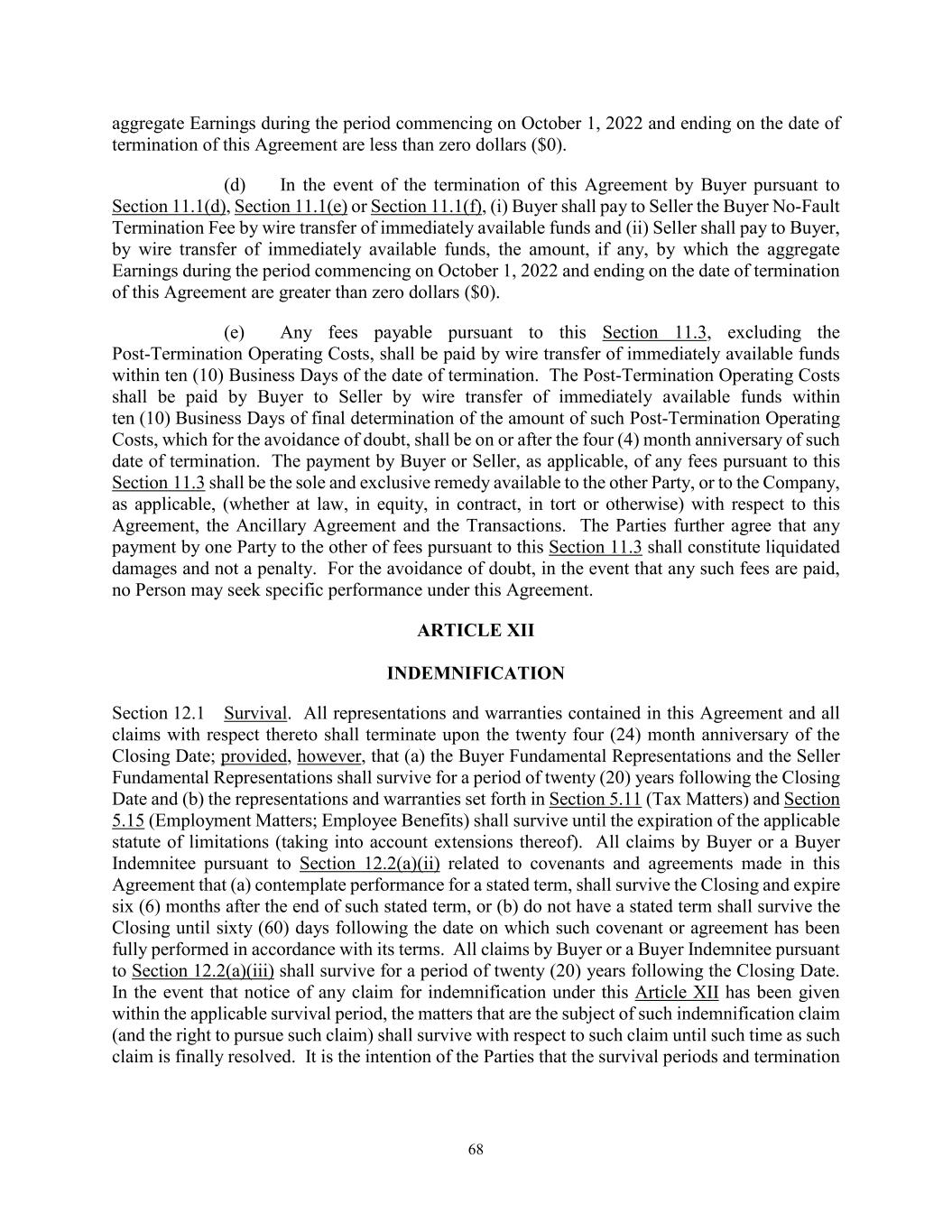 68 aggregate Earnings during the period commencing on October 1, 2022 and ending on the date of termination of this Agreement are less than zero dollars ($0). (d) In the event of the termination of this Agreement by Buyer pursuant to Section 11.1(d), Section 11.1(e) or Section 11.1(f), (i) Buyer shall pay to Seller the Buyer No-Fault Termination Fee by wire transfer of immediately available funds and (ii) Seller shall pay to Buyer, by wire transfer of immediately available funds, the amount, if any, by which the aggregate Earnings during the period commencing on October 1, 2022 and ending on the date of termination of this Agreement are greater than zero dollars ($0). (e) Any fees payable pursuant to this Section 11.3, excluding the Post-Termination Operating Costs, shall be paid by wire transfer of immediately available funds within ten (10) Business Days of the date of termination. The Post-Termination Operating Costs shall be paid by Buyer to Seller by wire transfer of immediately available funds within ten (10) Business Days of final determination of the amount of such Post-Termination Operating Costs, which for the avoidance of doubt, shall be on or after the four (4) month anniversary of such date of termination. The payment by Buyer or Seller, as applicable, of any fees pursuant to this Section 11.3 shall be the sole and exclusive remedy available to the other Party, or to the Company, as applicable, (whether at law, in equity, in contract, in tort or otherwise) with respect to this Agreement, the Ancillary Agreement and the Transactions. The Parties further agree that any payment by one Party to the other of fees pursuant to this Section 11.3 shall constitute liquidated damages and not a penalty. For the avoidance of doubt, in the event that any such fees are paid, no Person may seek specific performance under this Agreement. ARTICLE XII INDEMNIFICATION Section 12.1 Survival. All representations and warranties contained in this Agreement and all claims with respect thereto shall terminate upon the twenty four (24) month anniversary of the Closing Date; provided, however, that (a) the Buyer Fundamental Representations and the Seller Fundamental Representations shall survive for a period of twenty (20) years following the Closing Date and (b) the representations and warranties set forth in Section 5.11 (Tax Matters) and Section 5.15 (Employment Matters; Employee Benefits) shall survive until the expiration of the applicable statute of limitations (taking into account extensions thereof). All claims by Buyer or a Buyer Indemnitee pursuant to Section 12.2(a)(ii) related to covenants and agreements made in this Agreement that (a) contemplate performance for a stated term, shall survive the Closing and expire six (6) months after the end of such stated term, or (b) do not have a stated term shall survive the Closing until sixty (60) days following the date on which such covenant or agreement has been fully performed in accordance with its terms. All claims by Buyer or a Buyer Indemnitee pursuant to Section 12.2(a)(iii) shall survive for a period of twenty (20) years following the Closing Date. In the event that notice of any claim for indemnification under this Article XII has been given within the applicable survival period, the matters that are the subject of such indemnification claim (and the right to pursue such claim) shall survive with respect to such claim until such time as such claim is finally resolved. It is the intention of the Parties that the survival periods and termination