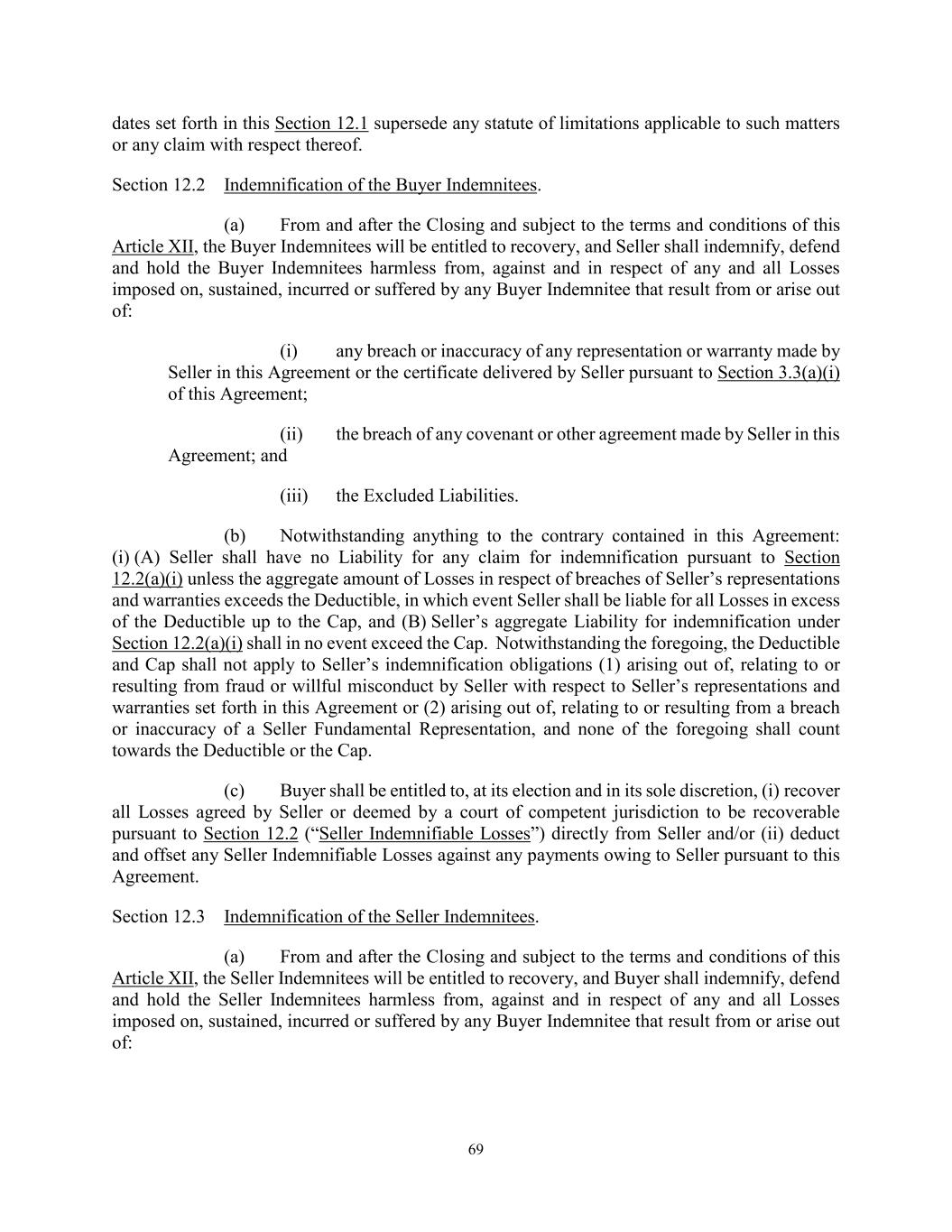 69 dates set forth in this Section 12.1 supersede any statute of limitations applicable to such matters or any claim with respect thereof. Section 12.2 Indemnification of the Buyer Indemnitees. (a) From and after the Closing and subject to the terms and conditions of this Article XII, the Buyer Indemnitees will be entitled to recovery, and Seller shall indemnify, defend and hold the Buyer Indemnitees harmless from, against and in respect of any and all Losses imposed on, sustained, incurred or suffered by any Buyer Indemnitee that result from or arise out of: (i) any breach or inaccuracy of any representation or warranty made by Seller in this Agreement or the certificate delivered by Seller pursuant to Section 3.3(a)(i) of this Agreement; (ii) the breach of any covenant or other agreement made by Seller in this Agreement; and (iii) the Excluded Liabilities. (b) Notwithstanding anything to the contrary contained in this Agreement: (i) (A) Seller shall have no Liability for any claim for indemnification pursuant to Section 12.2(a)(i) unless the aggregate amount of Losses in respect of breaches of Seller’s representations and warranties exceeds the Deductible, in which event Seller shall be liable for all Losses in excess of the Deductible up to the Cap, and (B) Seller’s aggregate Liability for indemnification under Section 12.2(a)(i) shall in no event exceed the Cap. Notwithstanding the foregoing, the Deductible and Cap shall not apply to Seller’s indemnification obligations (1) arising out of, relating to or resulting from fraud or willful misconduct by Seller with respect to Seller’s representations and warranties set forth in this Agreement or (2) arising out of, relating to or resulting from a breach or inaccuracy of a Seller Fundamental Representation, and none of the foregoing shall count towards the Deductible or the Cap. (c) Buyer shall be entitled to, at its election and in its sole discretion, (i) recover all Losses agreed by Seller or deemed by a court of competent jurisdiction to be recoverable pursuant to Section 12.2 (“Seller Indemnifiable Losses”) directly from Seller and/or (ii) deduct and offset any Seller Indemnifiable Losses against any payments owing to Seller pursuant to this Agreement. Section 12.3 Indemnification of the Seller Indemnitees. (a) From and after the Closing and subject to the terms and conditions of this Article XII, the Seller Indemnitees will be entitled to recovery, and Buyer shall indemnify, defend and hold the Seller Indemnitees harmless from, against and in respect of any and all Losses imposed on, sustained, incurred or suffered by any Buyer Indemnitee that result from or arise out of: