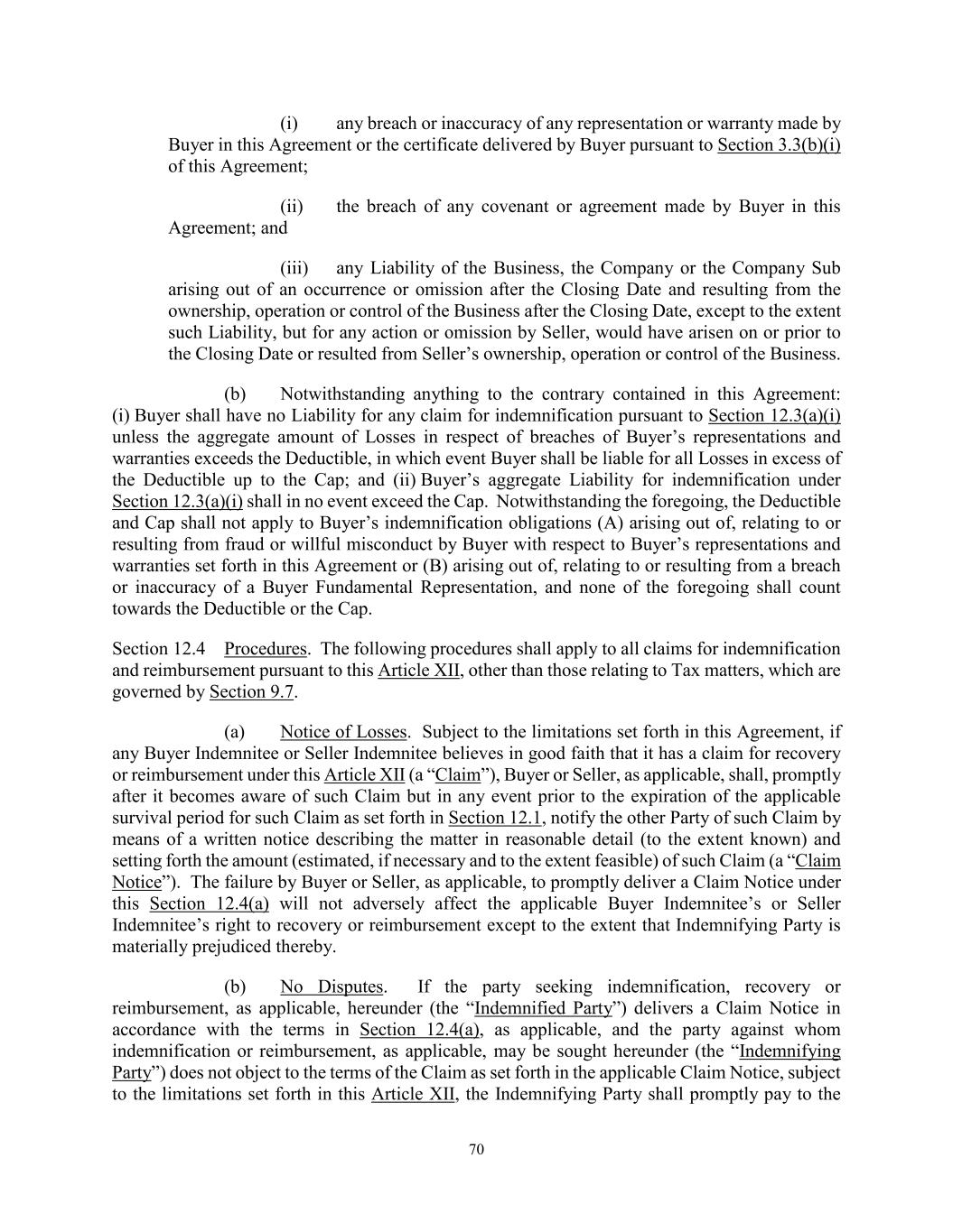 70 (i) any breach or inaccuracy of any representation or warranty made by Buyer in this Agreement or the certificate delivered by Buyer pursuant to Section 3.3(b)(i) of this Agreement; (ii) the breach of any covenant or agreement made by Buyer in this Agreement; and (iii) any Liability of the Business, the Company or the Company Sub arising out of an occurrence or omission after the Closing Date and resulting from the ownership, operation or control of the Business after the Closing Date, except to the extent such Liability, but for any action or omission by Seller, would have arisen on or prior to the Closing Date or resulted from Seller’s ownership, operation or control of the Business. (b) Notwithstanding anything to the contrary contained in this Agreement: (i) Buyer shall have no Liability for any claim for indemnification pursuant to Section 12.3(a)(i) unless the aggregate amount of Losses in respect of breaches of Buyer’s representations and warranties exceeds the Deductible, in which event Buyer shall be liable for all Losses in excess of the Deductible up to the Cap; and (ii) Buyer’s aggregate Liability for indemnification under Section 12.3(a)(i) shall in no event exceed the Cap. Notwithstanding the foregoing, the Deductible and Cap shall not apply to Buyer’s indemnification obligations (A) arising out of, relating to or resulting from fraud or willful misconduct by Buyer with respect to Buyer’s representations and warranties set forth in this Agreement or (B) arising out of, relating to or resulting from a breach or inaccuracy of a Buyer Fundamental Representation, and none of the foregoing shall count towards the Deductible or the Cap. Section 12.4 Procedures. The following procedures shall apply to all claims for indemnification and reimbursement pursuant to this Article XII, other than those relating to Tax matters, which are governed by Section 9.7. (a) Notice of Losses. Subject to the limitations set forth in this Agreement, if any Buyer Indemnitee or Seller Indemnitee believes in good faith that it has a claim for recovery or reimbursement under this Article XII (a “Claim”), Buyer or Seller, as applicable, shall, promptly after it becomes aware of such Claim but in any event prior to the expiration of the applicable survival period for such Claim as set forth in Section 12.1, notify the other Party of such Claim by means of a written notice describing the matter in reasonable detail (to the extent known) and setting forth the amount (estimated, if necessary and to the extent feasible) of such Claim (a “Claim Notice”). The failure by Buyer or Seller, as applicable, to promptly deliver a Claim Notice under this Section 12.4(a) will not adversely affect the applicable Buyer Indemnitee’s or Seller Indemnitee’s right to recovery or reimbursement except to the extent that Indemnifying Party is materially prejudiced thereby. (b) No Disputes. If the party seeking indemnification, recovery or reimbursement, as applicable, hereunder (the “Indemnified Party”) delivers a Claim Notice in accordance with the terms in Section 12.4(a), as applicable, and the party against whom indemnification or reimbursement, as applicable, may be sought hereunder (the “Indemnifying Party”) does not object to the terms of the Claim as set forth in the applicable Claim Notice, subject to the limitations set forth in this Article XII, the Indemnifying Party shall promptly pay to the
