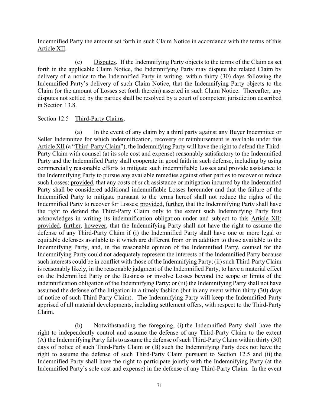 71 Indemnified Party the amount set forth in such Claim Notice in accordance with the terms of this Article XII. (c) Disputes. If the Indemnifying Party objects to the terms of the Claim as set forth in the applicable Claim Notice, the Indemnifying Party may dispute the related Claim by delivery of a notice to the Indemnified Party in writing, within thirty (30) days following the Indemnified Party’s delivery of such Claim Notice, that the Indemnifying Party objects to the Claim (or the amount of Losses set forth therein) asserted in such Claim Notice. Thereafter, any disputes not settled by the parties shall be resolved by a court of competent jurisdiction described in Section 13.8. Section 12.5 Third-Party Claims. (a) In the event of any claim by a third party against any Buyer Indemnitee or Seller Indemnitee for which indemnification, recovery or reimbursement is available under this Article XII (a “Third-Party Claim”), the Indemnifying Party will have the right to defend the Third- Party Claim with counsel (at its sole cost and expense) reasonably satisfactory to the Indemnified Party and the Indemnified Party shall cooperate in good faith in such defense, including by using commercially reasonable efforts to mitigate such indemnifiable Losses and provide assistance to the Indemnifying Party to pursue any available remedies against other parties to recover or reduce such Losses; provided, that any costs of such assistance or mitigation incurred by the Indemnified Party shall be considered additional indemnifiable Losses hereunder and that the failure of the Indemnified Party to mitigate pursuant to the terms hereof shall not reduce the rights of the Indemnified Party to recover for Losses; provided, further, that the Indemnifying Party shall have the right to defend the Third-Party Claim only to the extent such Indemnifying Party first acknowledges in writing its indemnification obligation under and subject to this Article XII; provided, further, however, that the Indemnifying Party shall not have the right to assume the defense of any Third-Party Claim if (i) the Indemnified Party shall have one or more legal or equitable defenses available to it which are different from or in addition to those available to the Indemnifying Party, and, in the reasonable opinion of the Indemnified Party, counsel for the Indemnifying Party could not adequately represent the interests of the Indemnified Party because such interests could be in conflict with those of the Indemnifying Party; (ii) such Third-Party Claim is reasonably likely, in the reasonable judgment of the Indemnified Party, to have a material effect on the Indemnified Party or the Business or involve Losses beyond the scope or limits of the indemnification obligation of the Indemnifying Party; or (iii) the Indemnifying Party shall not have assumed the defense of the litigation in a timely fashion (but in any event within thirty (30) days of notice of such Third-Party Claim). The Indemnifying Party will keep the Indemnified Party apprised of all material developments, including settlement offers, with respect to the Third-Party Claim. (b) Notwithstanding the foregoing, (i) the Indemnified Party shall have the right to independently control and assume the defense of any Third-Party Claim to the extent (A) the Indemnifying Party fails to assume the defense of such Third-Party Claim within thirty (30) days of notice of such Third-Party Claim or (B) such the Indemnifying Party does not have the right to assume the defense of such Third-Party Claim pursuant to Section 12.5 and (ii) the Indemnified Party shall have the right to participate jointly with the Indemnifying Party (at the Indemnified Party’s sole cost and expense) in the defense of any Third-Party Claim. In the event