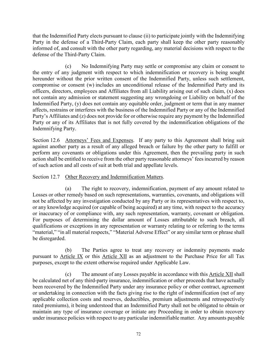 72 that the Indemnified Party elects pursuant to clause (ii) to participate jointly with the Indemnifying Party in the defense of a Third-Party Claim, each party shall keep the other party reasonably informed of, and consult with the other party regarding, any material decisions with respect to the defense of the Third-Party Claim. (c) No Indemnifying Party may settle or compromise any claim or consent to the entry of any judgment with respect to which indemnification or recovery is being sought hereunder without the prior written consent of the Indemnified Party, unless such settlement, compromise or consent (w) includes an unconditional release of the Indemnified Party and its officers, directors, employees and Affiliates from all Liability arising out of such claim, (x) does not contain any admission or statement suggesting any wrongdoing or Liability on behalf of the Indemnified Party, (y) does not contain any equitable order, judgment or term that in any manner affects, restrains or interferes with the business of the Indemnified Party or any of the Indemnified Party’s Affiliates and (z) does not provide for or otherwise require any payment by the Indemnified Party or any of its Affiliates that is not fully covered by the indemnification obligations of the Indemnifying Party. Section 12.6 Attorneys’ Fees and Expenses. If any party to this Agreement shall bring suit against another party as a result of any alleged breach or failure by the other party to fulfill or perform any covenants or obligations under this Agreement, then the prevailing party in such action shall be entitled to receive from the other party reasonable attorneys’ fees incurred by reason of such action and all costs of suit at both trial and appellate levels. Section 12.7 Other Recovery and Indemnification Matters. (a) The right to recovery, indemnification, payment of any amount related to Losses or other remedy based on such representations, warranties, covenants, and obligations will not be affected by any investigation conducted by any Party or its representatives with respect to, or any knowledge acquired (or capable of being acquired) at any time, with respect to the accuracy or inaccuracy of or compliance with, any such representation, warranty, covenant or obligation. For purposes of determining the dollar amount of Losses attributable to such breach, all qualifications or exceptions in any representation or warranty relating to or referring to the terms “material,” “in all material respects,” “Material Adverse Effect” or any similar term or phrase shall be disregarded. (b) The Parties agree to treat any recovery or indemnity payments made pursuant to Article IX or this Article XII as an adjustment to the Purchase Price for all Tax purposes, except to the extent otherwise required under Applicable Law. (c) The amount of any Losses payable in accordance with this Article XII shall be calculated net of any third-party insurance, indemnification or other proceeds that have actually been recovered by the Indemnified Party under any insurance policy or other contract, agreement or undertaking in connection with the facts giving rise to the right of indemnification (net of any applicable collection costs and reserves, deductibles, premium adjustments and retrospectively rated premiums), it being understood that an Indemnified Party shall not be obligated to obtain or maintain any type of insurance coverage or initiate any Proceeding in order to obtain recovery under insurance policies with respect to any particular indemnifiable matter. Any amounts payable