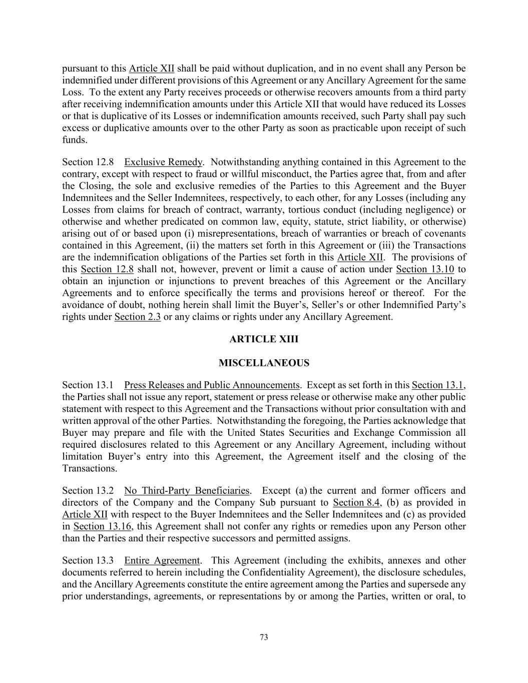 73 pursuant to this Article XII shall be paid without duplication, and in no event shall any Person be indemnified under different provisions of this Agreement or any Ancillary Agreement for the same Loss. To the extent any Party receives proceeds or otherwise recovers amounts from a third party after receiving indemnification amounts under this Article XII that would have reduced its Losses or that is duplicative of its Losses or indemnification amounts received, such Party shall pay such excess or duplicative amounts over to the other Party as soon as practicable upon receipt of such funds. Section 12.8 Exclusive Remedy. Notwithstanding anything contained in this Agreement to the contrary, except with respect to fraud or willful misconduct, the Parties agree that, from and after the Closing, the sole and exclusive remedies of the Parties to this Agreement and the Buyer Indemnitees and the Seller Indemnitees, respectively, to each other, for any Losses (including any Losses from claims for breach of contract, warranty, tortious conduct (including negligence) or otherwise and whether predicated on common law, equity, statute, strict liability, or otherwise) arising out of or based upon (i) misrepresentations, breach of warranties or breach of covenants contained in this Agreement, (ii) the matters set forth in this Agreement or (iii) the Transactions are the indemnification obligations of the Parties set forth in this Article XII. The provisions of this Section 12.8 shall not, however, prevent or limit a cause of action under Section 13.10 to obtain an injunction or injunctions to prevent breaches of this Agreement or the Ancillary Agreements and to enforce specifically the terms and provisions hereof or thereof. For the avoidance of doubt, nothing herein shall limit the Buyer’s, Seller’s or other Indemnified Party’s rights under Section 2.3 or any claims or rights under any Ancillary Agreement. ARTICLE XIII MISCELLANEOUS Section 13.1 Press Releases and Public Announcements. Except as set forth in this Section 13.1, the Parties shall not issue any report, statement or press release or otherwise make any other public statement with respect to this Agreement and the Transactions without prior consultation with and written approval of the other Parties. Notwithstanding the foregoing, the Parties acknowledge that Buyer may prepare and file with the United States Securities and Exchange Commission all required disclosures related to this Agreement or any Ancillary Agreement, including without limitation Buyer’s entry into this Agreement, the Agreement itself and the closing of the Transactions. Section 13.2 No Third-Party Beneficiaries. Except (a) the current and former officers and directors of the Company and the Company Sub pursuant to Section 8.4, (b) as provided in Article XII with respect to the Buyer Indemnitees and the Seller Indemnitees and (c) as provided in Section 13.16, this Agreement shall not confer any rights or remedies upon any Person other than the Parties and their respective successors and permitted assigns. Section 13.3 Entire Agreement. This Agreement (including the exhibits, annexes and other documents referred to herein including the Confidentiality Agreement), the disclosure schedules, and the Ancillary Agreements constitute the entire agreement among the Parties and supersede any prior understandings, agreements, or representations by or among the Parties, written or oral, to