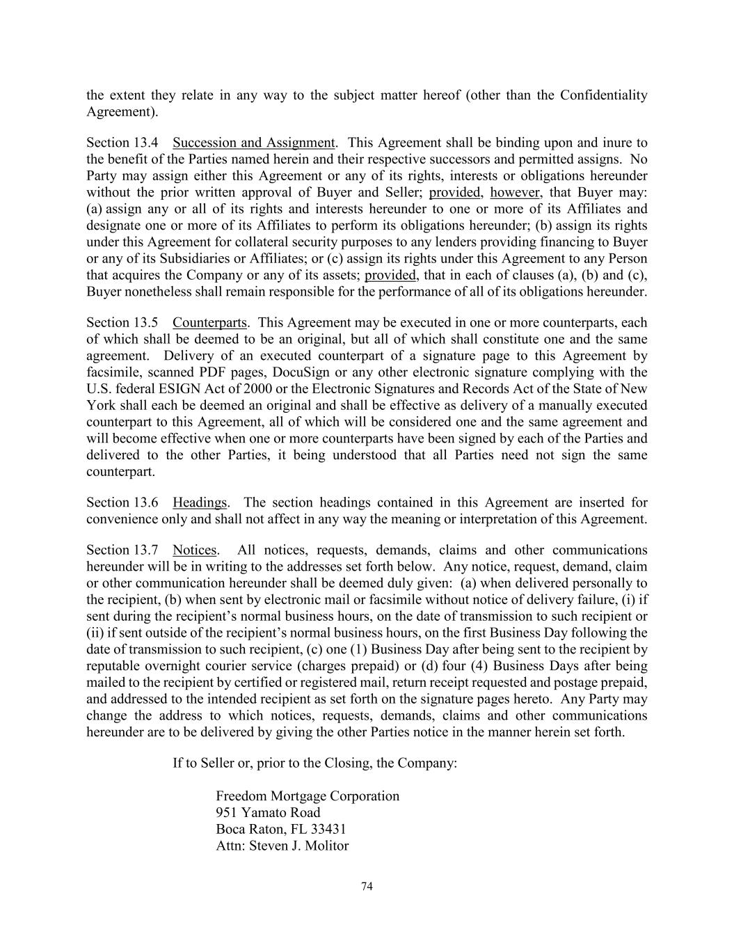 74 the extent they relate in any way to the subject matter hereof (other than the Confidentiality Agreement). Section 13.4 Succession and Assignment. This Agreement shall be binding upon and inure to the benefit of the Parties named herein and their respective successors and permitted assigns. No Party may assign either this Agreement or any of its rights, interests or obligations hereunder without the prior written approval of Buyer and Seller; provided, however, that Buyer may: (a) assign any or all of its rights and interests hereunder to one or more of its Affiliates and designate one or more of its Affiliates to perform its obligations hereunder; (b) assign its rights under this Agreement for collateral security purposes to any lenders providing financing to Buyer or any of its Subsidiaries or Affiliates; or (c) assign its rights under this Agreement to any Person that acquires the Company or any of its assets; provided, that in each of clauses (a), (b) and (c), Buyer nonetheless shall remain responsible for the performance of all of its obligations hereunder. Section 13.5 Counterparts. This Agreement may be executed in one or more counterparts, each of which shall be deemed to be an original, but all of which shall constitute one and the same agreement. Delivery of an executed counterpart of a signature page to this Agreement by facsimile, scanned PDF pages, DocuSign or any other electronic signature complying with the U.S. federal ESIGN Act of 2000 or the Electronic Signatures and Records Act of the State of New York shall each be deemed an original and shall be effective as delivery of a manually executed counterpart to this Agreement, all of which will be considered one and the same agreement and will become effective when one or more counterparts have been signed by each of the Parties and delivered to the other Parties, it being understood that all Parties need not sign the same counterpart. Section 13.6 Headings. The section headings contained in this Agreement are inserted for convenience only and shall not affect in any way the meaning or interpretation of this Agreement. Section 13.7 Notices. All notices, requests, demands, claims and other communications hereunder will be in writing to the addresses set forth below. Any notice, request, demand, claim or other communication hereunder shall be deemed duly given: (a) when delivered personally to the recipient, (b) when sent by electronic mail or facsimile without notice of delivery failure, (i) if sent during the recipient’s normal business hours, on the date of transmission to such recipient or (ii) if sent outside of the recipient’s normal business hours, on the first Business Day following the date of transmission to such recipient, (c) one (1) Business Day after being sent to the recipient by reputable overnight courier service (charges prepaid) or (d) four (4) Business Days after being mailed to the recipient by certified or registered mail, return receipt requested and postage prepaid, and addressed to the intended recipient as set forth on the signature pages hereto. Any Party may change the address to which notices, requests, demands, claims and other communications hereunder are to be delivered by giving the other Parties notice in the manner herein set forth. If to Seller or, prior to the Closing, the Company: Freedom Mortgage Corporation 951 Yamato Road Boca Raton, FL 33431 Attn: Steven J. Molitor
